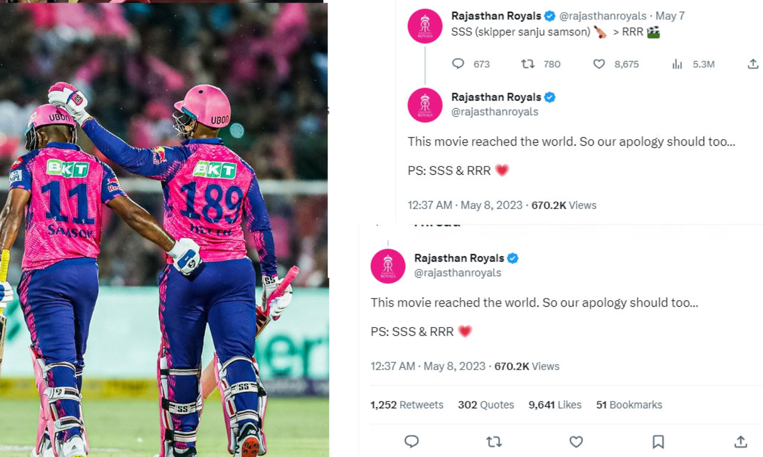 SSS അഥവാ സ്കിപ്പർ സഞ്ജു സാംസന്റെ ബാറ്റിംഗ് ആർ.ആർ.ആർ സിനിമയേക്കാൾ മഹത്തരമെന്നായിരുന്നു രാജസ്ഥാന്റെ ട്വീറ്റ്. എന്നാൽ മത്സരത്തിൽ പരാജയപ്പെടുകയും ട്വീറ്റ് ഏറെ വിമർശിക്കപ്പെടുകയും ചെയ്തു. മത്സരത്തിൽ വിജയിച്ചതോടെ അംപയർ നോബോൾ വിളിക്കുന്ന ചിത്രവുമായി സൺറൈസേഴ്സ് വിവാദ ട്വീറ്റിനോട് പ്രതികരിച്ചു. ഇതോടെ മെയ് എട്ടിന് അവർ മാപ്പ് പറഞ്ഞു. ഈ സിനിമ ലോക ശ്രദ്ധ നേടിയതാണ്, അതിനാൽ ഞങ്ങൾ മാപ്പു പറയേണ്ടതാണെന്ന് രാജസ്ഥാൻ ട്വിറ്ററിൽ കുറിച്ചു.