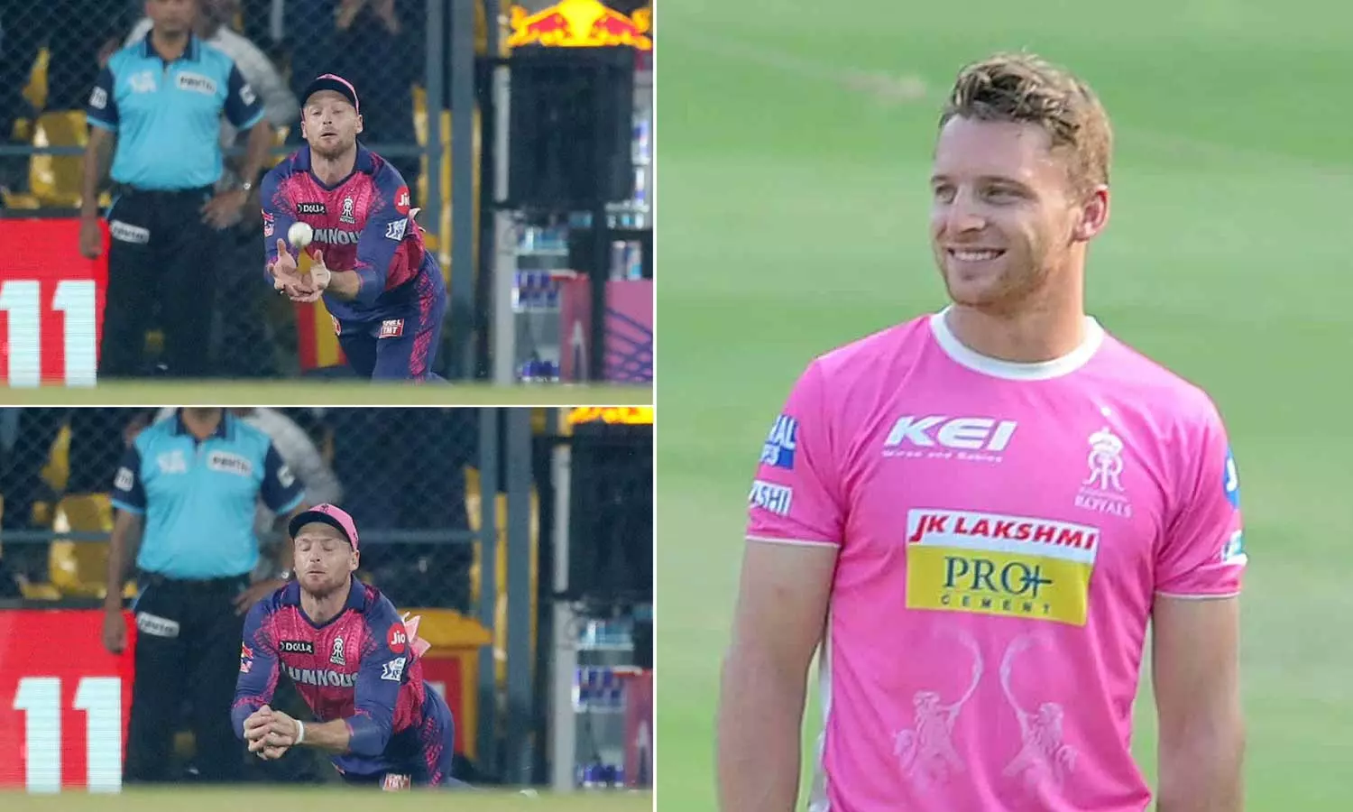 അതാവട്ടെ ക്ലിക്കായതുമില്ല. അക്കൗണ്ട് തുറക്കും മുമ്പെ അശ്വിനെ പഞ്ചാബ് ബൗളർമാർ പറഞ്ഞയച്ചു. പഞ്ചാബ് ബാറ്റർ ഷാറൂഖ് ഖാന്റെ ക്യാച്ച് എടുക്കുന്നതിനിടെയാണ് ബട്ലർക്ക് പരിക്കേൽക്കുന്നത്. ബൗണ്ടറി ലൈനിനരികിൽ ഫീൽഡ് ചെയ്യുകയായിരുന്ന ബട്ലർ, ഷാറൂഖ് ഉയർത്തിയടിച്ച പന്തിനായി ഓടിയടുക്കുകയും ഡൈവിലൂടെ പന്ത് കൈപ്പിടിയിലൊതുക്കുകയുമായിരുന്നു. ക്യാച്ചിന് ശേഷം വേദന കൊണ്ട് കൈ കുടയുന്ന ബട്ലറേയും കാണാമായിരുന്നു. ബട്ലറുടെ പരിക്കിന്റെ പിടിയിലാണെന്ന് നായകൻ സഞ്ജു സാംസൺ വ്യക്തമാക്കുകയും ചെയ്തു.