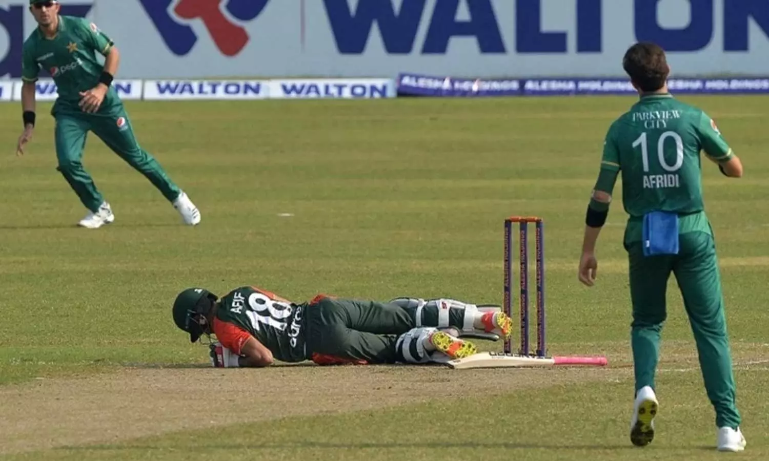 സിംഗിളിന് പോലും ശ്രമിക്കാതിരുന്ന ബാറ്റർക്ക് നേരെ അഫ്രീദി ദേഷ്യത്തോടെ പന്തെറിയുകയായിരുന്നുവെന്ന് വീഡിയോയിൽ വ്യക്തമാണ്. പന്ത് തട്ടി അഫീഫ് വീഴുകയും ചെയ്തു.