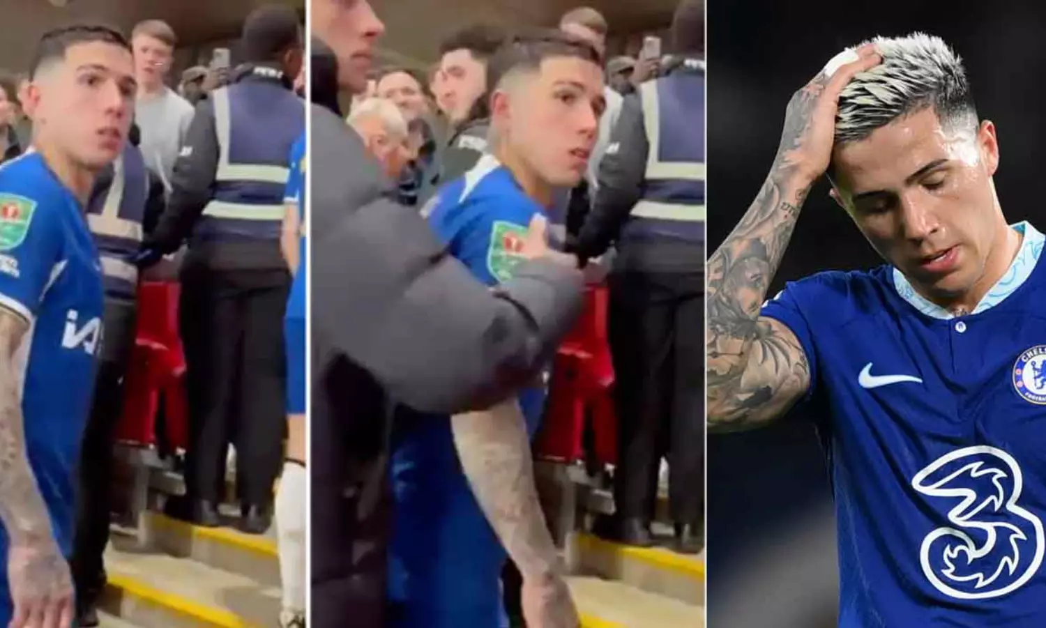 മത്സരശേഷം മടങ്ങുന്നതിനിടെ ചെൽസി താരം എൻസോ ഫെർണാണ്ടസിന്റെ വീഡിയോയാണ് ഇപ്പോൾ സമൂഹ മാധ്യമങ്ങളിൽ വൈറലായത്. നിരാശരായി മടങ്ങവെ കാണികളിൽ നിന്നുള്ള പ്രതികരണമാണ് അർജന്റൈൻ യുവതാരത്തെ ചൊടിപ്പിച്ചത്. ലിവർപൂൾ ആരാധകന്റെ കളിയാക്കലിനെ തുടർന്ന് എൻസോ രൂക്ഷമായി നോക്കുകയും പ്രതികരിക്കാനൊരുങ്ങുകയുമായിരുന്നു. എന്നാൽ സഹതാരം കോൾ പാൽമർ താരത്തെ അനുനയിപ്പിച്ച് കൊണ്ടുപോകുകയായിരുന്നു.