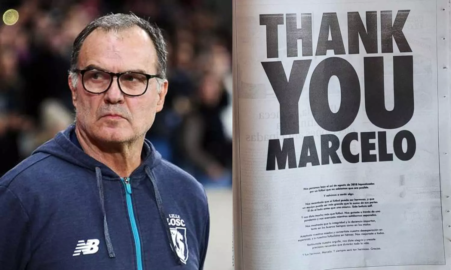 രണ്ടാം ഡിവിഷനിൽ നിന്ന് പ്രീമിയർ ലീഗിലേക്ക് മുന്നേറാൻ സഹായിച്ച കോച്ച് മാഴ്സലോ ബിയൽസയെ പുറത്താക്കിയ ലീഡ്സ് യുനൈറ്റഡ് മാനേജ്മെന്റിനോട് 'പകവീട്ടി' ക്ലബ്ബിന്റെ ആരാധകർ. അർജന്റീനക്കാരനായ ബിയൽസക്ക്, അദ്ദേഹത്തിന്റെ നാട്ടിലെ ഏറ്റവും ജനപ്രിയമായ പത്രത്തിൽ മുഴുവൻ പേജ് പരസ്യം നൽകിയാണ് ലീഡ്സ് ആരാധകർ കടപ്പാട് പ്രഖ്യാപിച്ചത്.
