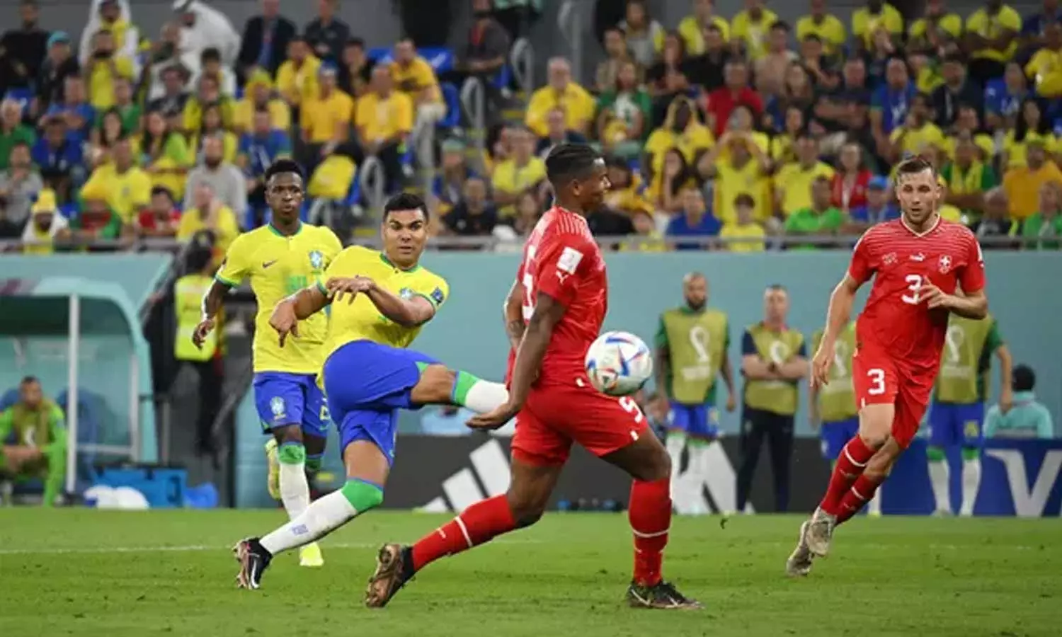 ദോഹ: ആദ്യ വിസിൽ മുഴുങ്ങിയത് മുതൽ സ്വിറ്റ്സർലാൻഡ് ഒരുക്കിയത് ഉഗ്രൻ പ്രതിരോധ കോട്ട. ആദ്യ പകുതിയിൽ കോട്ട ഭേദിക്കാൻ റിച്ചാർലിസണും വിനീഷ്യസ് ജൂനിയറും കിണഞ്ഞുപരിശ്രമിച്ചെങ്കിലും നടന്നില്ല. അതിനിടെ വിനീഷ്യസിലൂടെ ഒരു ഗോൾ നേടിയെങ്കിലും ഓഫ്സൈഡ് കെണിയിൽ കുരുങ്ങി. ഒടുവിൽ 83ാം മിനുറ്റിൽ കാസിമിറോയിലൂടെ ആ ഗോൾ വന്നു. അതോടെ ബ്രസീൽ പ്രീ ക്വാർട്ടറിൽ(1-0)