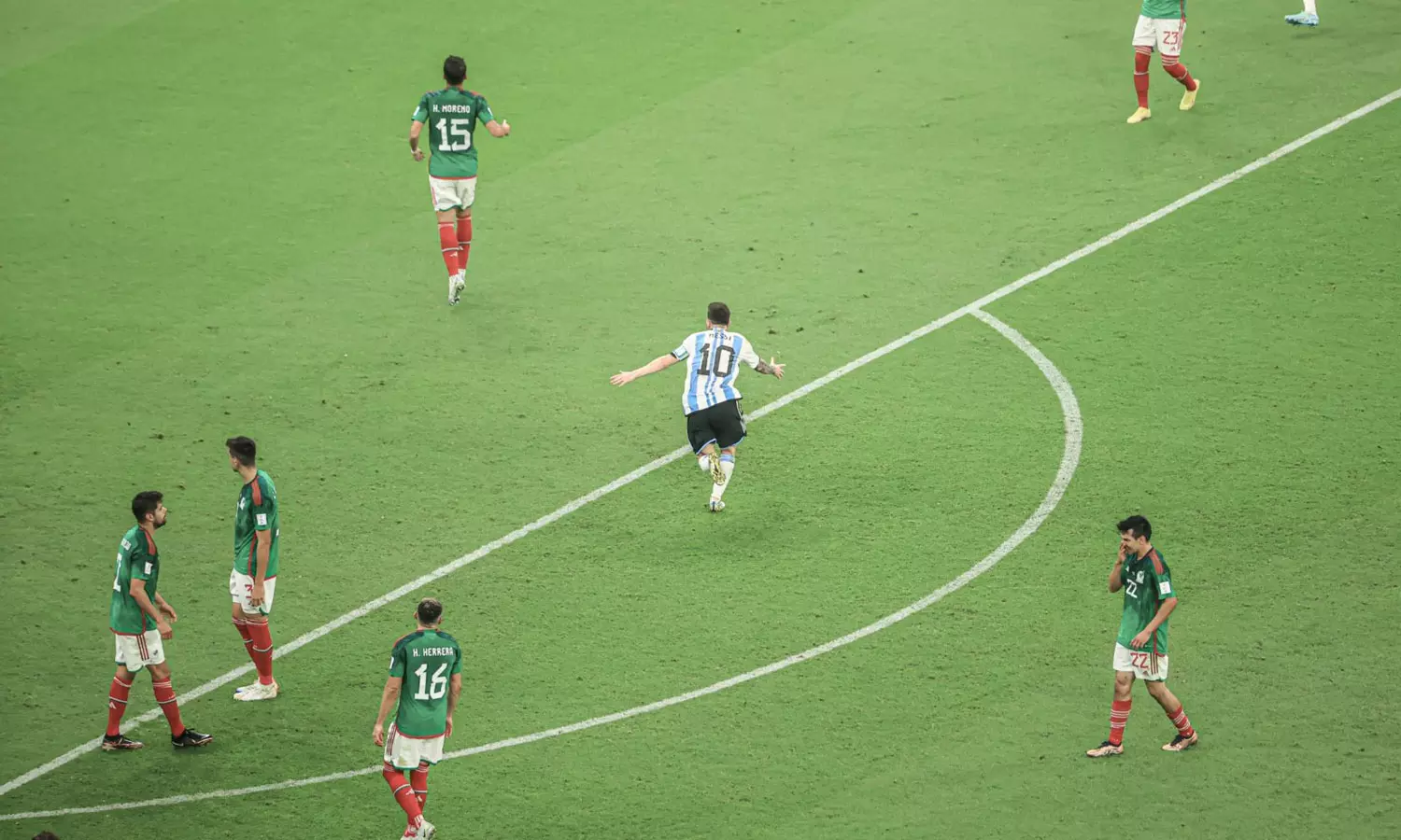 കോച്ചിന്റെ പദ്ധതികൾ ആദ്യ പകുതിയിൽ മെക്സിക്കോ നന്നായി നടപ്പാക്കുകയും ചെയ്തു. അർജന്റൈൻ നീക്കങ്ങളെ തുടക്കത്തിലേ കൊന്ന് കളിയുടെ സ്വാഭാവിക ഒഴുക്ക് തടസ്സപ്പെടുത്തുകയാണ് അവർ ചെയ്തത്. മെസ്സിയിലേക്കും മെസ്സിയിൽ നിന്ന് പുറത്തേക്കുമുള്ള വിതരണം പൂർണമായി വിച്ഛേദിച്ചു. മെസ്സിക്കു മാത്രമല്ല, മധ്യനിരയിലുണ്ടായിരുന്ന റോഡ്രിഗസ്, ഡി പോൾ, ഡി മരിയ, മക് അലിസ്റ്റർ എന്നിവർക്കെല്ലാം സ്പേസ് നിഷേധിച്ചു. ഒരു പ്രസ്സിങ് മെഷീൻ പോലെയാണ് മെക്സിക്കോ കളത്തിലുണ്ടായിരുന്നത്. ആദ്യ പകുതിയിൽ 15 ഫൗളുകളാണ് ഉണ്ടായത്. ഇതിൽ മിക്കതും മെക്സിക്കൻ കളിക്കാരുടേതായിരുന്നു. ആദ്യ പകുതി അവസാനിക്കുമ്പോൾ ഒരു ഓൺ ടാർഗറ്റ് ഷോട്ട് മാത്രമാണ് കളിയിൽ ഉണ്ടായത്. കളിയുടെ വിരസത തെളിയിക്കുന്ന കണക്കായിരുന്നു ഇത്. 87-ാം മിനിറ്റിൽ മനോഹരമായ ഒരു കർവിങ് ഗോളിലൂടെ എൻസോ ഫെർണാണ്ടസ് അർജന്റീനയ്ക്ക് രണ്ടാം ഗോൾ സമ്മാനിച്ചു. അപ്പോഴേക്കും ഹതാശരായിക്കഴിഞ്ഞിരുന്നു മെക്സിക്കോ.