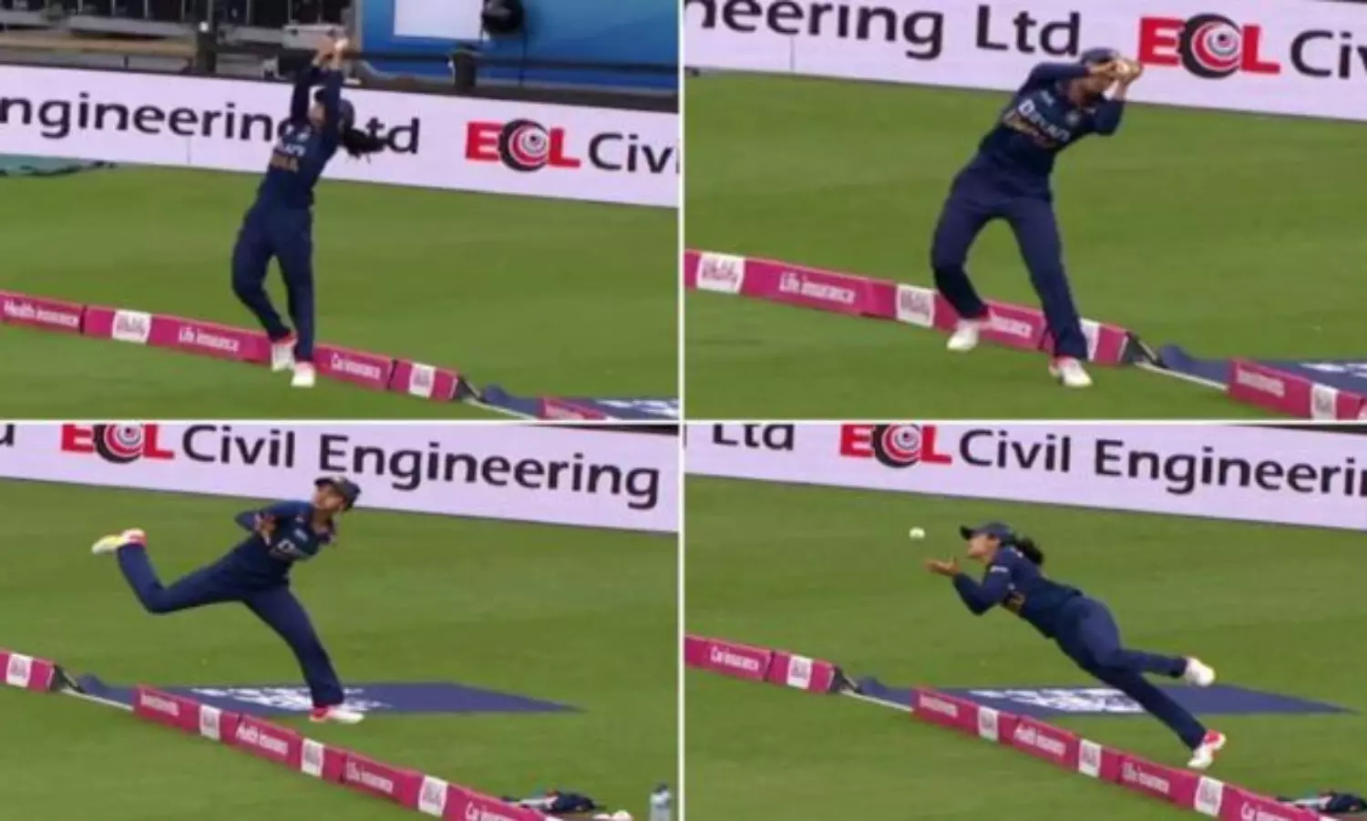 ഇന്നലെ നോർത്താംപ്ടണിൽ ഇംഗ്ലണ്ടിനെതിരെ നടന്ന ടി20 മത്സരത്തിലായിരുന്നു ഇന്ത്യയുടെ സൂപ്പർ താരമായ ഹാർലീന്റെ കണ്ണഞ്ചിപ്പിക്കും ക്യാച്ച്. 27 പന്തിൽ നാല് ബൗണ്ടറിയും രണ്ട് സിക്സും സഹിതം 43 റൺസുമായി കത്തിക്കയറുകയായിരുന്ന ഇംഗ്ലീഷ് താരം ആമി ജോൺസിനെ പുറത്താക്കാനെടുത്തതായിരുന്നു ആ ക്യാച്ച്. തൂക്കിയടിച്ച പന്ത് ബൗണ്ടറിലൈനിൽനിന്ന് പറന്നെടുക്കുകയായിരുന്നു ഹാർലീൻ. ഓടിയെത്തി കൈയിലൊതുക്കിയ ശേഷം പന്ത് ബൗണ്ടറി കടക്കാതിരിക്കാൻ വാനിലേക്കെറിഞ്ഞു. തുടർന്ന് ബൗണ്ടറിലൈനിനപ്പുറത്തുനിന്ന് തിരിച്ച് ഗ്രൗണ്ടിലേക്ക് പറന്നാണ് ആ ക്യാച്ചെടുത്തത്. മത്സരത്തില് ഇന്ത്യ 18 റണ്സിന് പരാജയപ്പെട്ടെങ്കിലും ഹാര്ലീന്റെ ക്യാച്ചായിരുന്നു കളിയിലെ ഏറ്റവും മികച്ച നിമിഷം.