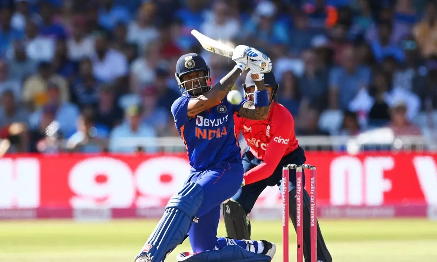വലിയ വിജയലക്ഷ്യത്തിലേക്ക് ബാറ്റ് വീശിയ ഇന്ത്യയുടെ തുടക്കം വീഴ്ചയോടെയായിരുന്നു. രണ്ടാം ഓവറിലെ ആദ്യ പന്തില് തന്നെ ഒരു റൺസുമായി റിഷഭ് പന്ത് പുറത്തായി. മൂന്നാം ഓവറിൽ കോഹ്ലിയും നിരാശപ്പെടുത്തി 11 റൺസ് മാത്രമാണ് കോഹ്ലിക്ക് നേടാനായത്. പവർ പ്ലേ തീരും മുമ്പ് തന്നെ നായകൻ രോഹിത്തും (11) തിരികെ നടന്നു. അവിടെ നിന്ന് ക്രീസിലെത്തിയ സൂര്യകുമാർ ഇംഗ്ലണ്ട് ബോളർമാരെ തലങ്ങും വിലങ്ങും പ്രഹരിച്ചു. 49 പന്തിലാണ് സൂര്യകുമാർ യാദവ് സെഞ്ച്വറി തികച്ചത്. 12 ബൗണ്ടറികളും 5 സിക്സറുകളും സൂര്യകുമാറിന്റെ ബാറ്റിൽ നിന്ന് പിറന്നു.