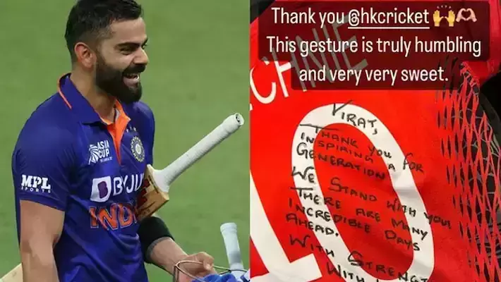 ഏറെ നാളിന് ശേഷം മികച്ച ഇന്നിങ്സുമായ കളംനിറഞ്ഞ കോഹ്ലിക്ക് മത്സരശേഷം ആശംസകള് പകര്ന്നുകൊണ്ടാണ് ഹോങ്കോങ് ടീം ജേഴ്സി സമ്മാനിച്ചത്. ഹോങ്കോങ് ടീമിലെ എല്ലാ താരങ്ങളും ഒപ്പിട്ട ജേഴ്സിയാണ് അവര് സമ്മാനിച്ചത്. അതില് എഴുതിയ വരികള് ഇങ്ങനെയാണ്. ''ഒരു തലമുറയെ മുഴുവന് പ്രചോദിപ്പിച്ചതിന് നന്ദി വിരാട്. ഞങ്ങള് നിങ്ങള്ക്കൊപ്പമുണ്ട്. ഒരുപാട് നല്ല ദിവസങ്ങള് ഇനിയും നിങ്ങള്ക്കായി വരാനുണ്ട്.'' ടീം ഹോങ്കോങ്.