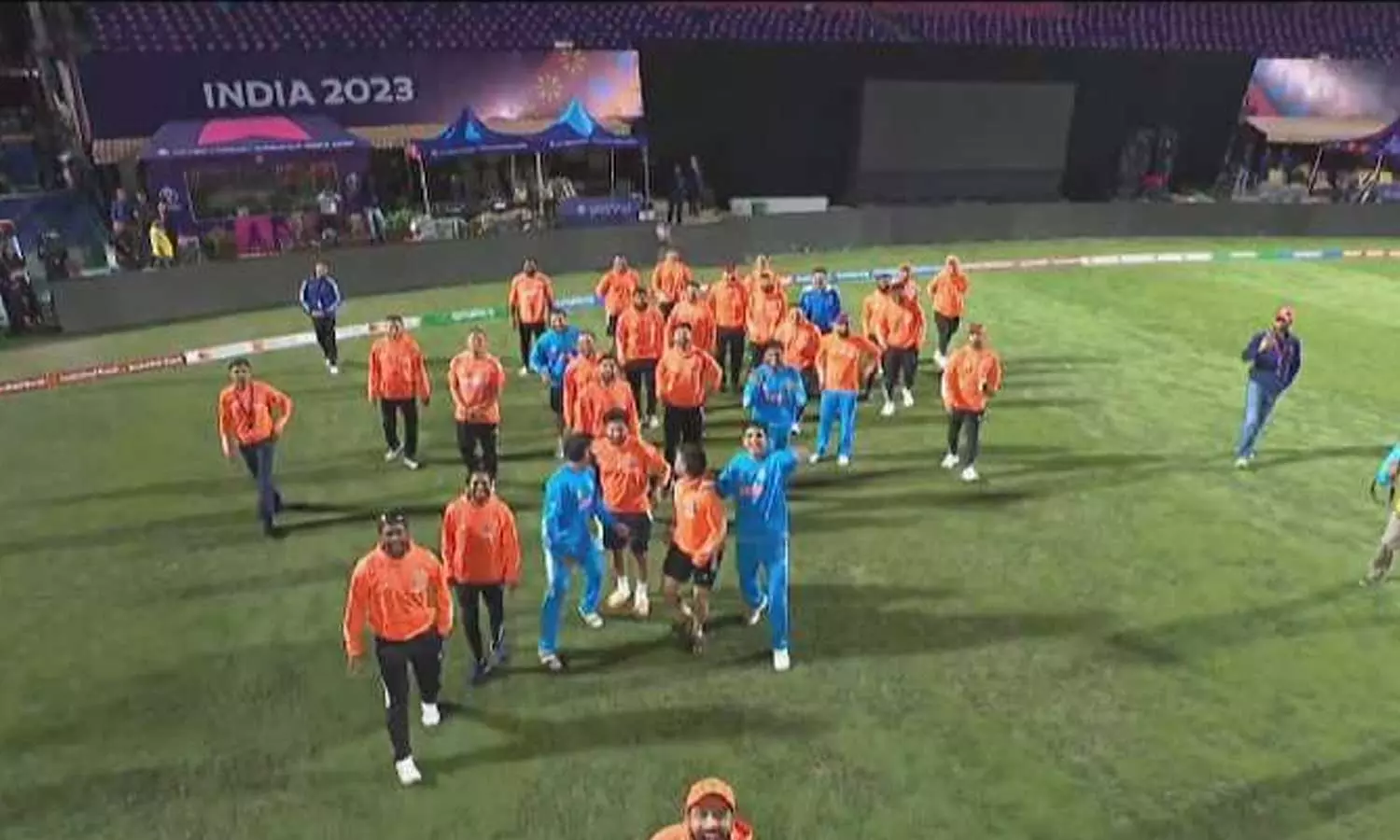 ''ചില പിഴവുകൾ നമുക്ക് സംഭവിച്ചു. എന്നിരുന്നാലും ധരംശാലയിലെ കടുപ്പമേറിയ സാഹചര്യത്തില് നമ്മള് ഫീല്ഡിങ്ങില് മികച്ചു നിന്നു. കോഹ്ലിയും സിറാജും അയ്യരും മിന്നും പ്രകടനമാണ് പുറത്തെടുത്തത്. ഇനി അവാര്ഡ് പ്രഖ്യാപനം.''- ടി.ദിലീപ് ഇതുപറഞ്ഞവസാനിപ്പിച്ചപ്പോള് ഇന്ത്യന് താരങ്ങള് ആകാംക്ഷയോടെ ടി.വി സ്ക്രീനിലേക്ക് കണ്ണും നട്ടിരുന്നു. സാധാരണ ടി.വി സ്ക്രീനിലുടെയാണ് വിജയിയെ പ്രഖ്യാപിച്ചിരുന്നത്. ഇക്കുറി ദിലീപ് ഒരൽപ്പം കടന്ന് വലിയൊരു വ്യത്യസ്തത കണ്ടെത്തി.