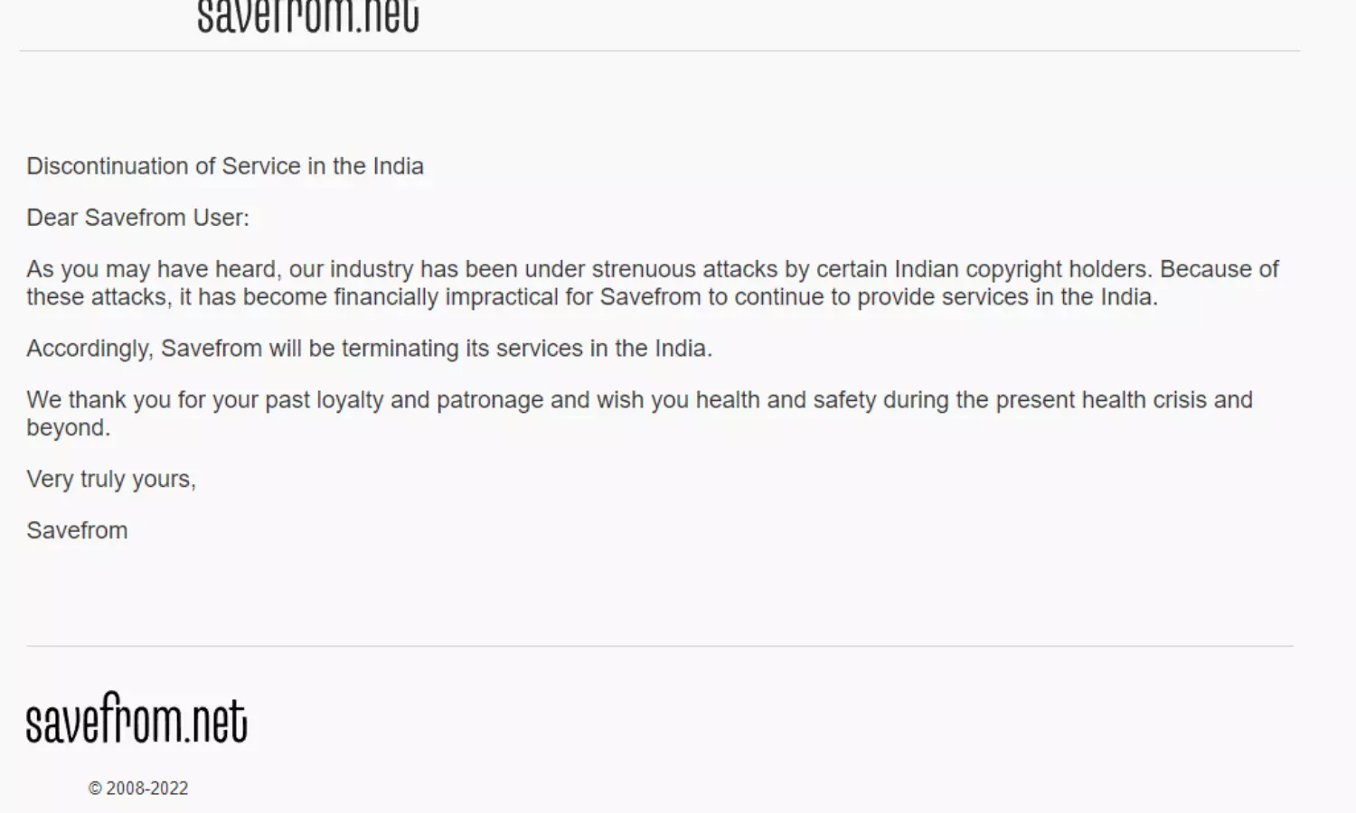 പക്ഷേ ഇപ്പോൾ സേവ് ഫ്രം നെറ്റ് ഇന്ത്യയിലെ സേവനം അവസാനിപ്പിച്ചിരിക്കുകയാണ്. കോപ്പി റൈറ്റ് പ്രശ്നങ്ങൾ കണക്കിലെടുത്താണ് ഇങ്ങനെയൊരു തീരുമാനത്തിലേക്ക് കമ്പനിയെത്തിയത്.