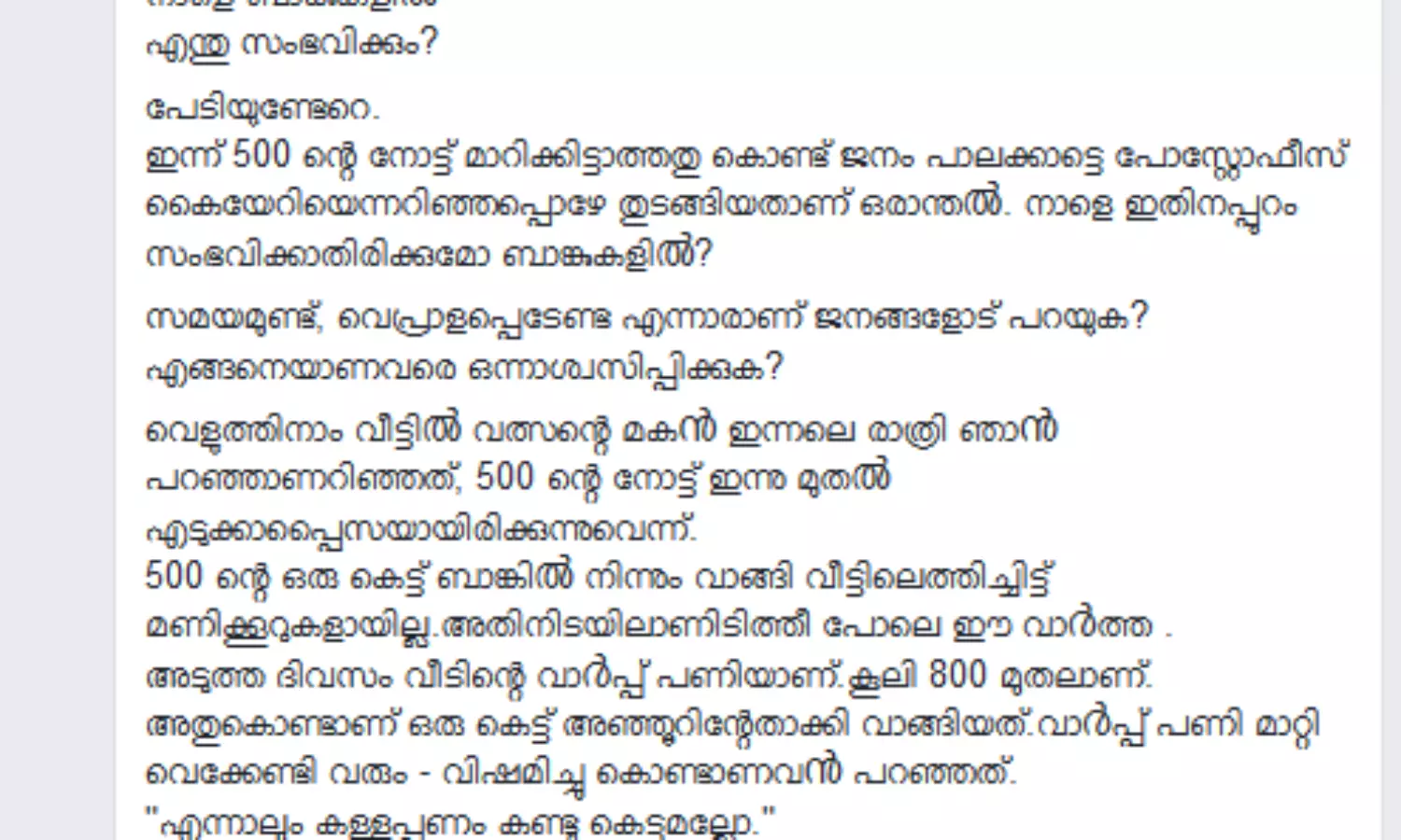നാളെ ബാങ്കുകളിൽ എന്തു സംഭവിക്കും? പേടിയുണ്ടേറെ.ഇന്ന് 500 ന്റെ നോട്ട് മാറിക്കിട്ടാത്തതു കൊണ്ട് ജനം പാലക്കാട്ടെ പോസ്റ്റോഫീസ് കൈയേറിയെന്നറിഞ്ഞപ്പൊഴേ തുടങ്ങിയതാണ് ഒരാന്തൽ. നാളെ ഇതിനപ്പുറം സംഭവിക്കാതിരിക്കുമോ ബാങ്കുകളിൽ? സമയമുണ്ട്, വെപ്രാളപ്പെടേണ്ട എന്നാരാണ് ജനങ്ങളോട് പറയുക? എങ്ങനെയാണവരെ ഒന്നാശ്വസിപ്പിക്കുക? വെളുത്തിനാം വീട്ടിൽ വത്സന്റെ മകൻ ഇന്നലെ രാത്രി ഞാൻ പറഞ്ഞാണറിഞ്ഞത്, 500 ന്റെ നോട്ട് ഇന്നു മുതൽ എടുക്കാപ്പൈസയായിരിക്കുന്നുവെന്ന്. 500 ന്റെ ഒരു കെട്ട് ബാങ്കിൽ നിന്നും വാങ്ങി വീട്ടിലെത്തിച്ചിട്ട് മണിക്കൂറുകളായില്ല.അതിനിടയിലാണിടിത്തീ പോലെ ഈ വാർത്ത . അടുത്ത ദിവസം വീടിന്റെ വാർപ്പ് പണിയാണ്.കൂലി 800 മുതലാണ്. അതുകൊണ്ടാണ് ഒരു കെട്ട് അഞ്ഞൂറിന്റേതാക്കി വാങ്ങിയത്.വാർപ്പ് പണി മാറ്റി വെക്കേണ്ടി വരും - വിഷമിച്ചു കൊണ്ടാണവൻ പറഞ്ഞത്.