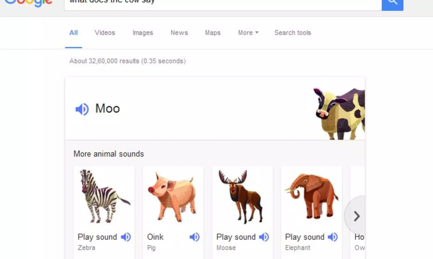 ഗൂഗിള് സെര്ച്ചില് 'animal noises' എന്ന് തിരഞ്ഞാല് വ്യത്യസ്ഥ മൃഗങ്ങളുടെ പടം ലഭിക്കുന്നതിനൊപ്പം അവയുടെ ശബ്ദം കേള്ക്കാനുള്ള ബട്ടണും സെര്ച്ച് റിസല്റ്റില് തന്നെ ഒരുക്കിയിരിക്കുനു.
