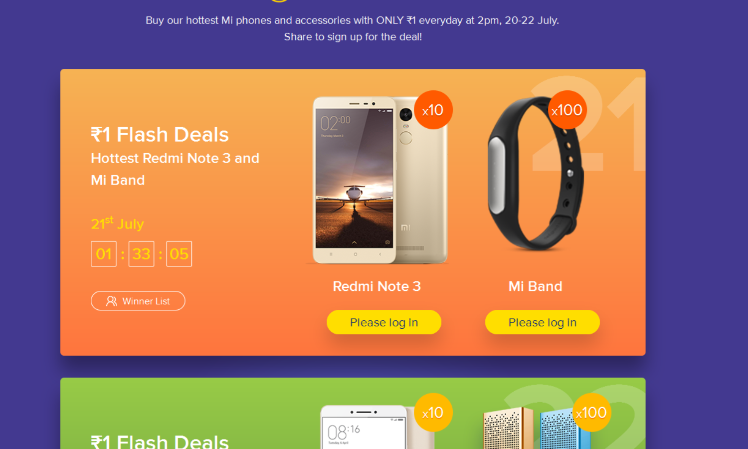 റെഡ് മി 3 നോട്ടും എംഐ ബാന്ഡുമാണ് ഇന്ന് ഒരു രൂപക്ക് നല്കുന്നത്. ഉച്ചക്ക് രണ്ട് മണി മുതല് വില്പ്പന ആരംഭിക്കും. 15000 രൂപ വരുന്ന എംഐ മാക്സും ബ്ലൂടൂത്ത് സ്പീക്കറുമാണ് നാളെ ഒരു രൂപക്ക് ലഭിക്കുന്ന ഉത്പന്നങ്ങള്. എത്ര പേര്ക്കാകും ഒരു രൂപക്ക് വില്പ്പന പദ്ധതിയുടെ പ്രയോജനം ലഭിക്കുക എന്ന് കമ്പനി ഇതുവരെ വ്യക്തമാക്കിയിട്ടില്ല. ഒരു രൂപ വില്പ്പനക്ക് പുറമെ പല ഉത്പന്നങ്ങളുടെയും വിലയും കുറച്ചിട്ടുണ്ട്.. 25000 രൂപയോളം വിലവരുന്ന എംഐ 5 ഉം 20000 എംഎഎച്ചിന്റെ പവ്വര് ബാങ്കുമാണ് ഒരു രൂപ നിരക്കില് ഇന്നലെ വില്പ്പന നടത്തിയിരുന്നത്.
