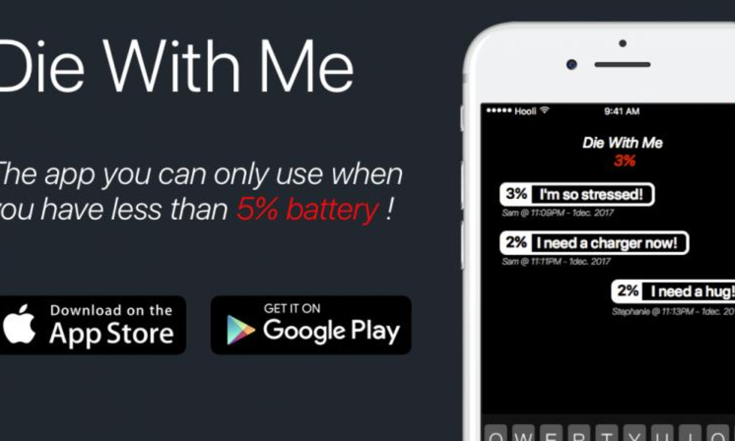 ഫോണില് ബാറ്ററി തീരാന് മിനിറ്റുകള് ബാക്കിയുള്ളപ്പോള് മാത്രം ഉപയോഗിക്കാന് കഴിയുന്ന ചാറ്റ് ആപ്പാണ് ഡൈ വിത് മി. ചാറ്റ് ചെയ്ത് ചാറ്റ് ചെയ്ത് ബാറ്ററി മരിക്കുകയും ഫോണ് സ്വിച്ച് ഓഫ് ആവുകയും ചെയ്യുന്നതു വരെ ആപ്പ് ഉപയോഗിക്കാം. എന്നാല് ബാറ്ററി തീരാറായി നില്കുന്ന മറ്റുള്ളവരുമായി മാത്രമേ ഈ ആപ്പില് ചാറ്റിങ് സാധിക്കൂ.