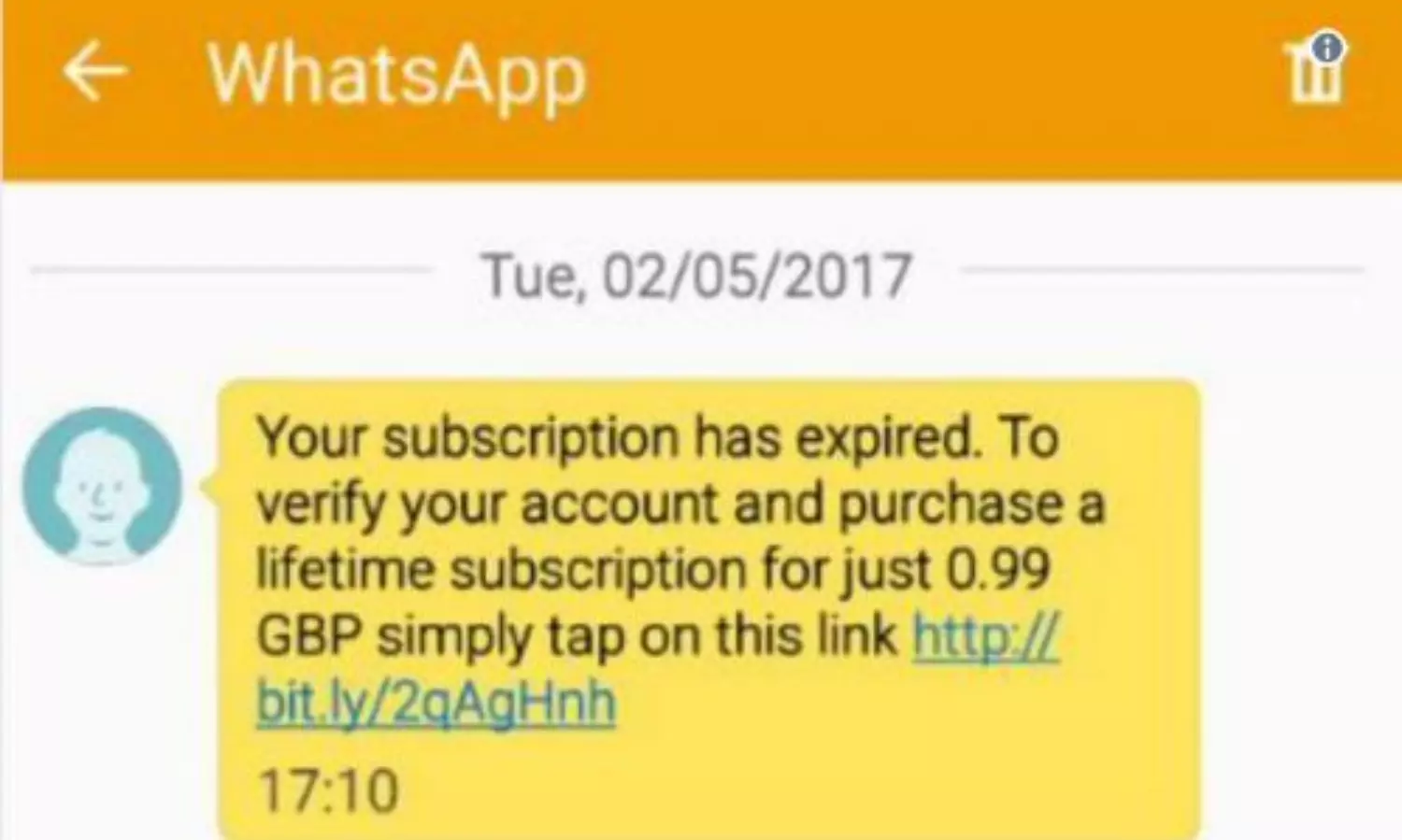 വാട്സ് ആപിന്റെ സബ്സ്ക്രിബ്ഷന് കാലാവധി കഴിഞ്ഞെന്നും പുതുക്കുന്നതിന് 0.99ബ്രിട്ടീഷ് പൗണ്ട് നല്കണമെന്നുമുള്ള സന്ദേശമാണ് പ്രചരിക്കുന്നത്...
