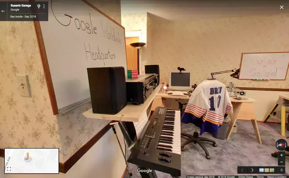 1998ലെ ഓഫീസ് സൂഷ്മമായി പുനഃസൃഷ്ടിച്ചിരിക്കുകയാണ് ഗൂഗിള്. കമ്പ്യൂട്ടറുകള് അടക്കം 90കളിലെ നിരവധി ഇലക്ട്രോണിക് ഉപകരണങ്ങള് ഈ ഓഫീസില് പലയിടത്തായി കണ്ടെത്താനാകും. രഹസ്യ വാതില് വരെ ഈ ഗാരേജില് കണ്ടെത്താനാകും. പലയിടത്തും സാധനങ്ങള് അലക്ഷ്യമായി ഇട്ടിരിക്കുകയാണ്. പിയാനോയും സൈക്കിളും തുടങ്ങി വാഷിംങ് മെഷീന് വരെ ഈ സ്ട്രീറ്റ് വ്യൂവിലുണ്ട്. ഗൂഗിളിന്റെ ഓരോ മുറിയിലും കയറിയിറങ്ങി വിശദമായി കാണാനുള്ള അവസരമാണ് സ്ട്രീറ്റ് വ്യൂ നല്കുന്നത്.