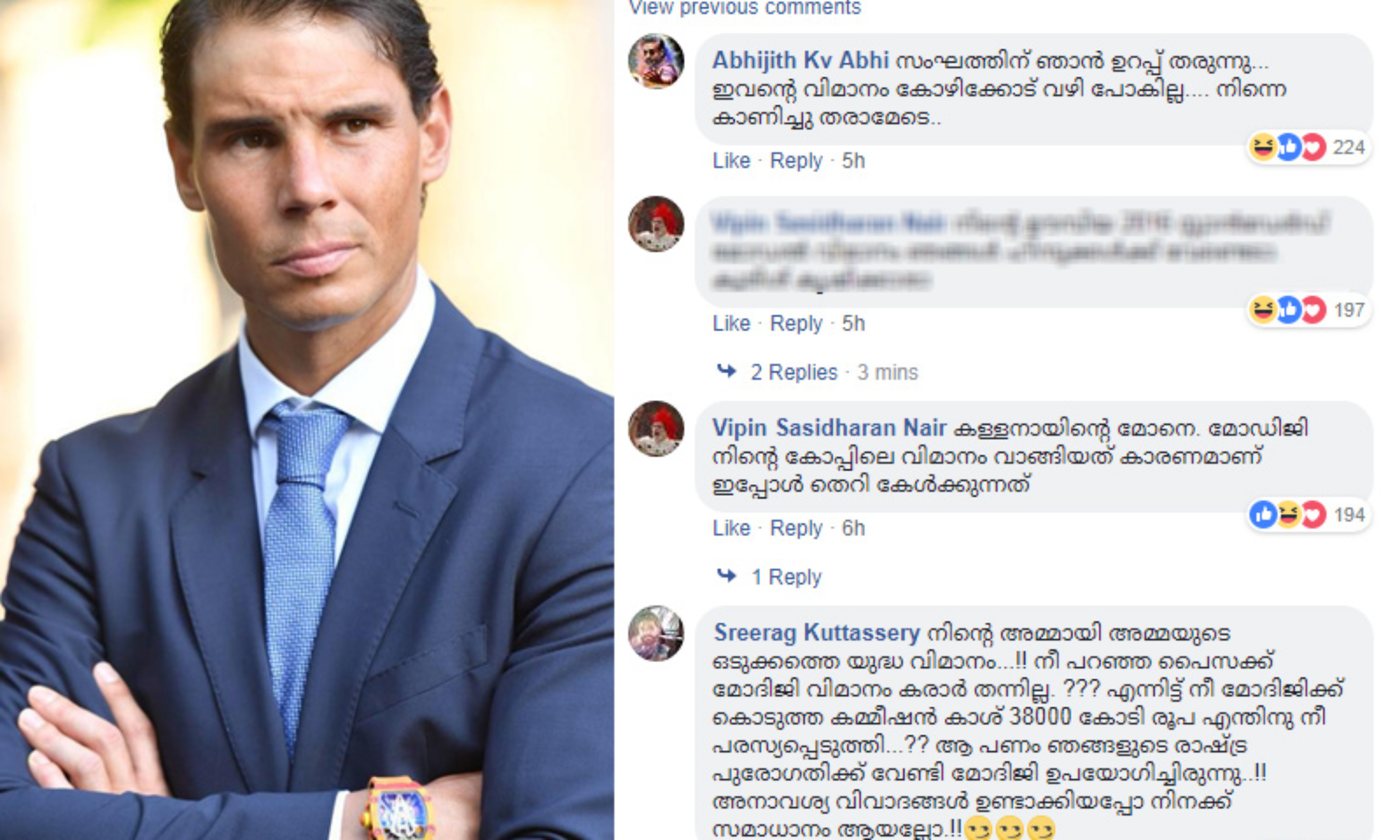 മാതൃരാജ്യമായ സ്പെയിനെ കുറിച്ച് നദാല് ഇട്ട ഫേസ്ബുക്ക് വീഡിയോക്ക് താഴെയുള്ള കമന്റുകളില് ഭൂരിഭാഗവും മലയാളത്തിലുള്ളതാണ്. ഒന്നും രണ്ടുമല്ല നൂറുകണക്കിന് മലയാളത്തിലുള്ള കമന്റുകളാണ് നദാലിന്റെ ഫേസ്ബുക്ക് പേജിന് കീഴില് വരുന്നത്. ആക്ഷേപഹാസ്യത്തിലും ചീത്തവിളിയിലുമൊക്കെയാണ് കമന്റുകള്. റഫാല് ഇടപാട് വിവാദമായതിനൊപ്പം റാഫേല് നദാലിനെ ബന്ധപ്പെടുത്തിയുള്ള ട്രോളുകളും പ്രചരിച്ചിരുന്നു. ഇതിനൊടുവിലാണ് നദാലിന്റെ ഫേസ്ബുക്ക് പേജില് തന്നെ ട്രോള് മഴയുമായി ഫേസ്ബുക്ക് മലയാളികള് എത്തിയിരിക്കുന്നത്.