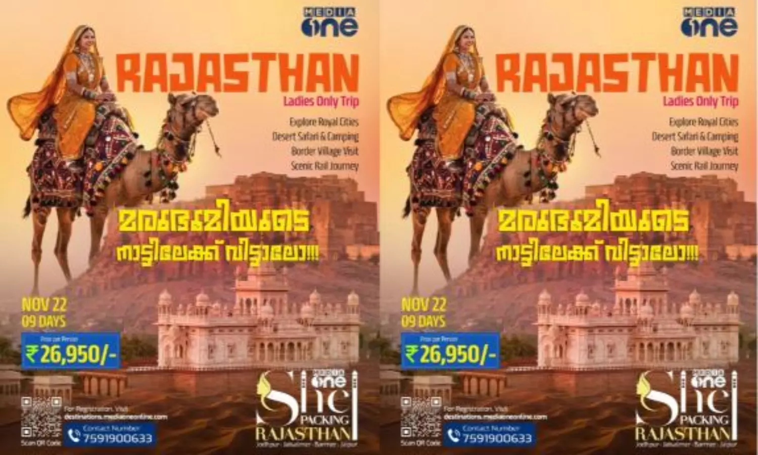 രാജസ്ഥാനിലെ രാജകീയ നഗരങ്ങൾ കണ്ടും മരുയാത്രയും മരുഭൂമിയിൽ ക്യാമ്പിങ്ങും അതിർത്തി ഗ്രാമങ്ങളിലെ സന്ദർശനവും യാത്രയുടെ ഭാഗമാണ്.