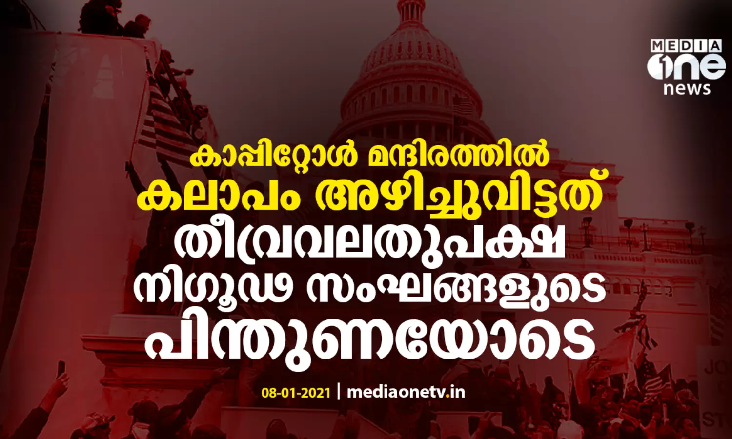 അമേരിക്കയിലെ കാപ്പിറ്റോൾ മന്ദിരത്തിൽ കഴിഞ്ഞ ദിവസം കലാപം അഴിച്ചുവിട്ടത് തീവ്രവലതുപക്ഷ നിഗൂഢ സംഘങ്ങളുടെ പിന്തുണയോടെ. പ്രൌഡ് ബോയ്സ്,ക്യുഎനോൺ തുടങ്ങിയ നിഗൂഢസംഘടനകള് അക്രമത്തിന് വ്യാപക പ്രചാരണം നടത്തിയിരുന്നു. അമേരിക്കയുടെ സമീപ കാലത്തെ ഏറ്റവും വലിയ സുരക്ഷാ വീഴ്ച ബോധപൂര്വമായിരുന്നു എന്ന ആരോപണവും ശക്തമാണ്.