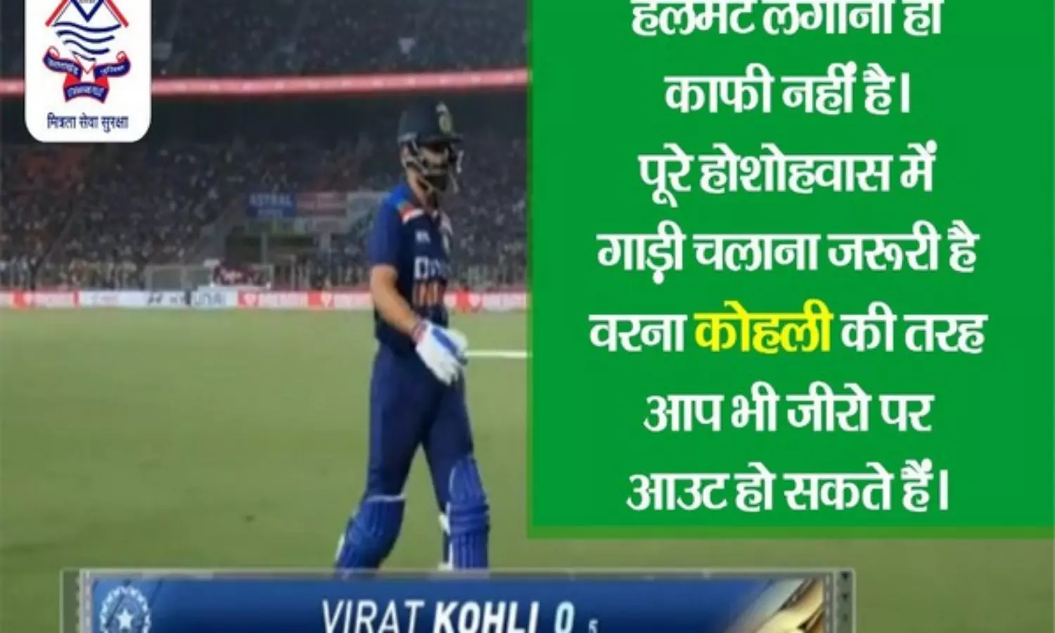 ''ഹെല്മറ്റ് മാത്രം പോരാ! പൂര്ണ ബോധത്തോടെ വാഹനമോടിച്ചില്ലെങ്കില് കോഹ്ലിയെപ്പോലെ റണ്സ് നേടുന്നതിന് മുമ്പ് നിങ്ങളും പുറത്താകും...'' എന്നായിരുന്നു കോഹ്ലിയുടെ ചിത്രത്തിനൊപ്പം ഉത്തരാഖണ്ഡ് പോലീസ് പുറത്തുവിട്ട പോസ്റ്റ്.
