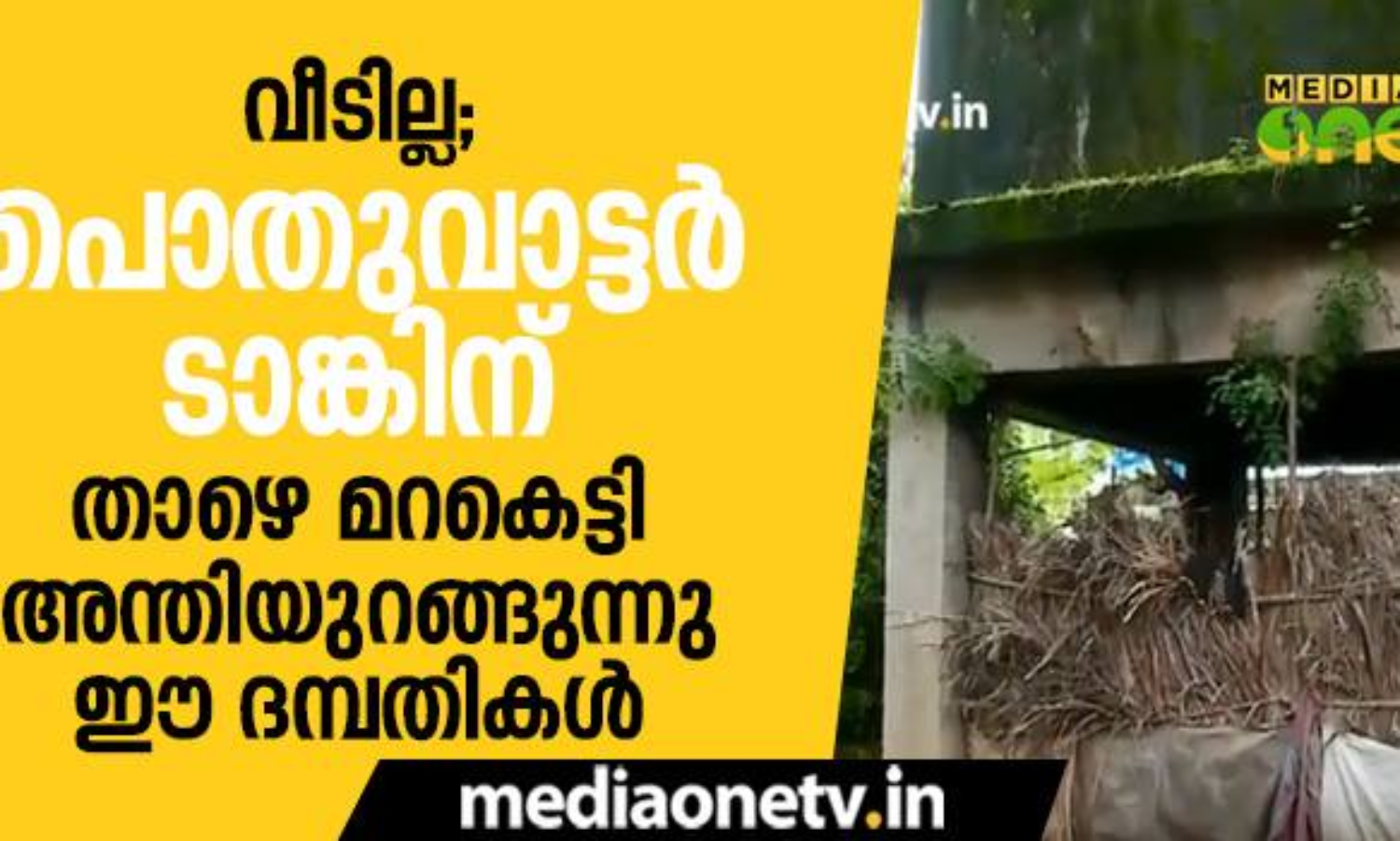 വീടില്ല; പൊതുവാട്ടര്ടാങ്കിന് താഴെ മറകെട്ടി അന്തിയുറങ്ങുന്നു ഈ ദമ്പതികള്