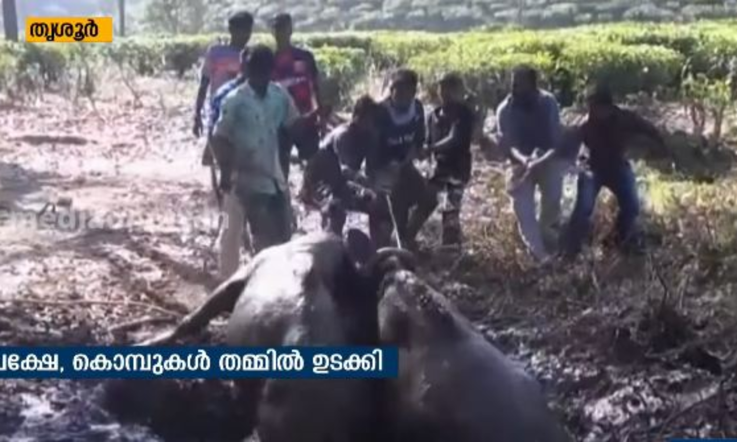 ഒന്നു കൊമ്പ് കോര്ത്തതാ, പക്ഷെ തമ്മിലുടക്കിപ്പോയി; കാട്ടുപോത്തുകളുടെ രക്ഷക്കെത്തി നാട്ടുകാര്