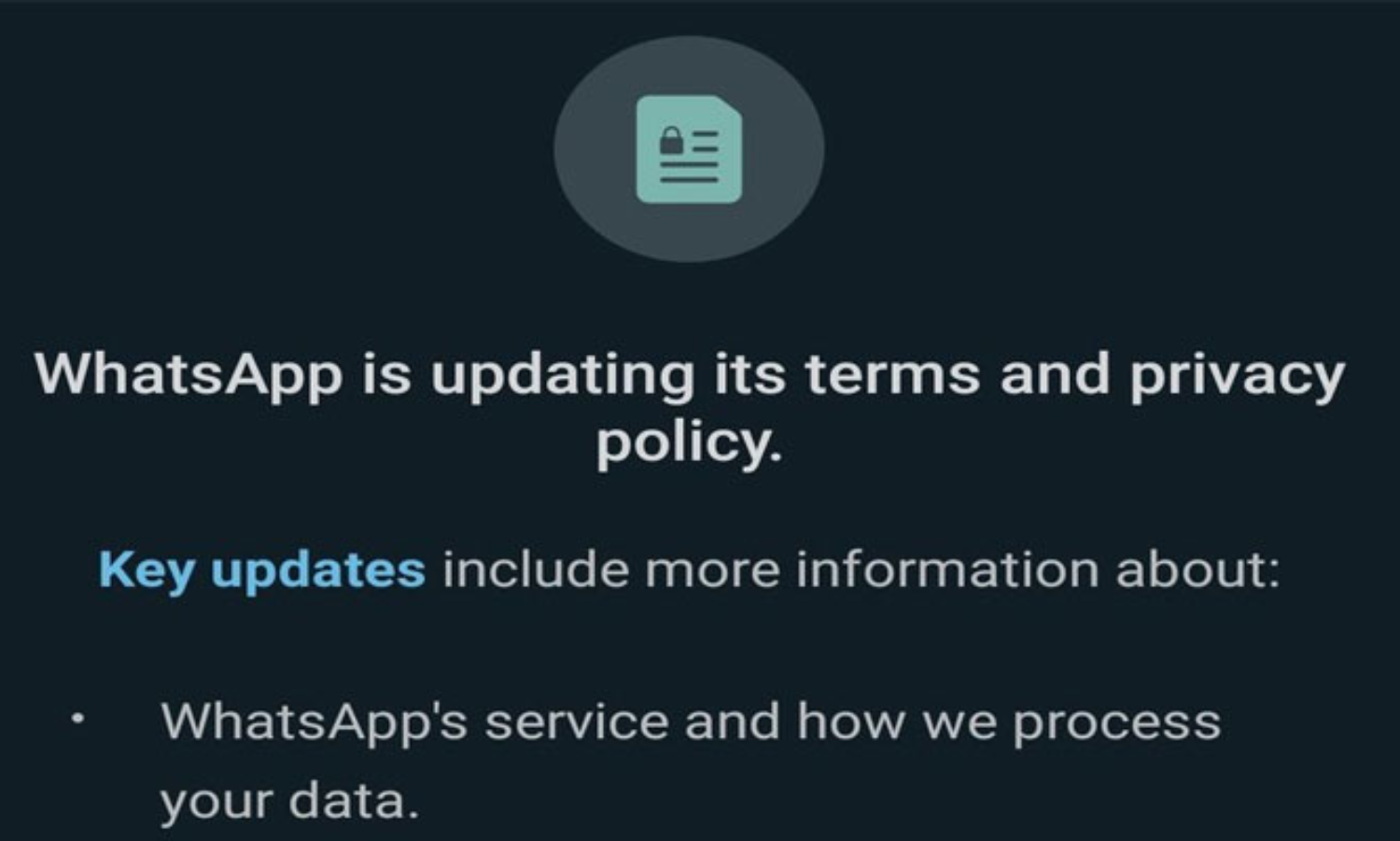 ഫേസ്ബുക്കിന്റെ ഉടമസ്ഥതയിലുള്ള മെസ്സേജിങ് ആപ്പായ വാട്സ്ആപ്പ് ഉപയോഗ നിബന്ധനങ്ങളും സ്വാകാര്യത നയങ്ങളും പരിഷ്കരിക്കുന്നു. ഇത് സംബന്ധിച്ച സന്ദേശം കമ്പനി ഇന്നലെ വൈകീട്ട് മുതൽ ഉപയോക്താക്കൾക് നൽകി തുടങ്ങി. "വാട്സ്ആപ്പ് അതിന്റെ ഉപയോഗ നിബന്ധനകളും സ്വകാര്യതാ നയങ്ങളും പരിഷ്കരിക്കുകയാണ് " ഉപയോക്താക്കൾക്കയച്ച സന്ദേശത്തിൽ കമ്പനി പറഞ്ഞു. തങ്ങളുടെ മാതൃ കമ്പനിയായ ഫേസ്ബുക്കുമായി ചാറ്റ് വിവരങ്ങൾ പങ്കുവെക്കാം ഉൾപ്പെടെയുള്ള പരിഷ്കരണങ്ങളാണ് കമ്പനി കൊണ്ട് വന്നത്. അടുത്ത മാസം എട്ടിനാണ് പുതിയ നിബന്ധനകൾ നിലവിൽ വരിക. നിബന്ധനകൾ അംഗീകരിച്ചാൽ മാത്രമേ ആപ്പ് തുടർന്ന് ഉപയോഗിക്കാൻ കഴിയുക.
