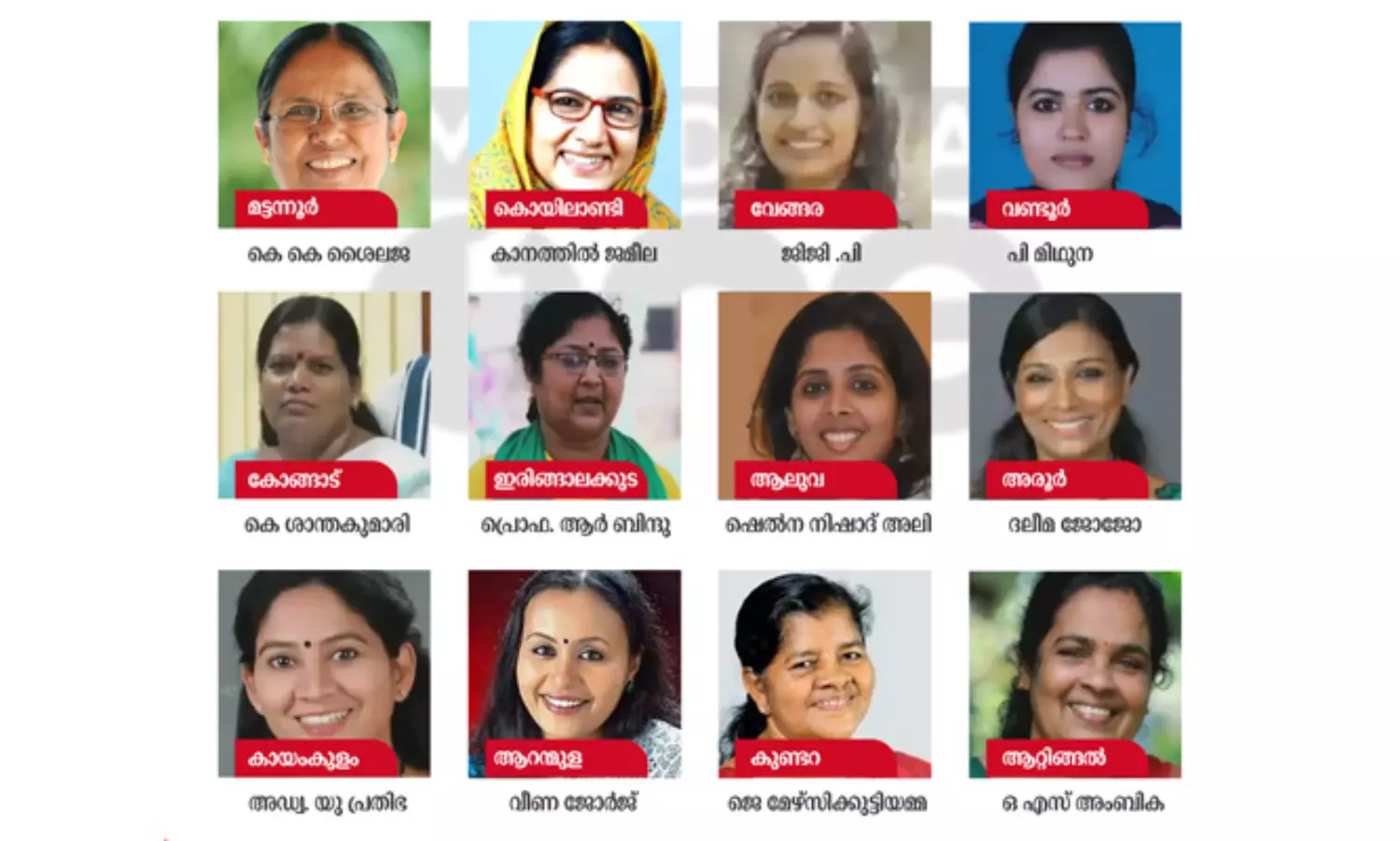 മന്ത്രിമാരായ കെ.കെ ശൈലജയ്ക്കും ജെ. മേഴ്സിക്കുട്ടിയമ്മയ്ക്കുമൊപ്പം എം.എല്.എമാരായ അഡ്വ. യു പ്രതിഭയും വീണ ജോര്ജും ഇത്തവണയും ജനവിധി തേടുന്നുണ്ട്. ബാക്കി എട്ടുപേരും പുതുമുഖങ്ങളാണ്. മട്ടന്നൂരില് കെ. കെ ശൈലജയും കുണ്ടറയില് ജെ. മേഴ്സിക്കുട്ടിയമ്മയും തന്നെ മത്സരിക്കും. അതുപോലെ കായംകുളം മണ്ഡലത്തില് നിന്ന് അഡ്വ. യു പ്രതിഭയും ആറന്മുളയില് നിന്ന് വീണ ജോര്ജും തന്നെയാണ് ജനവിധി തേടുന്നത്.