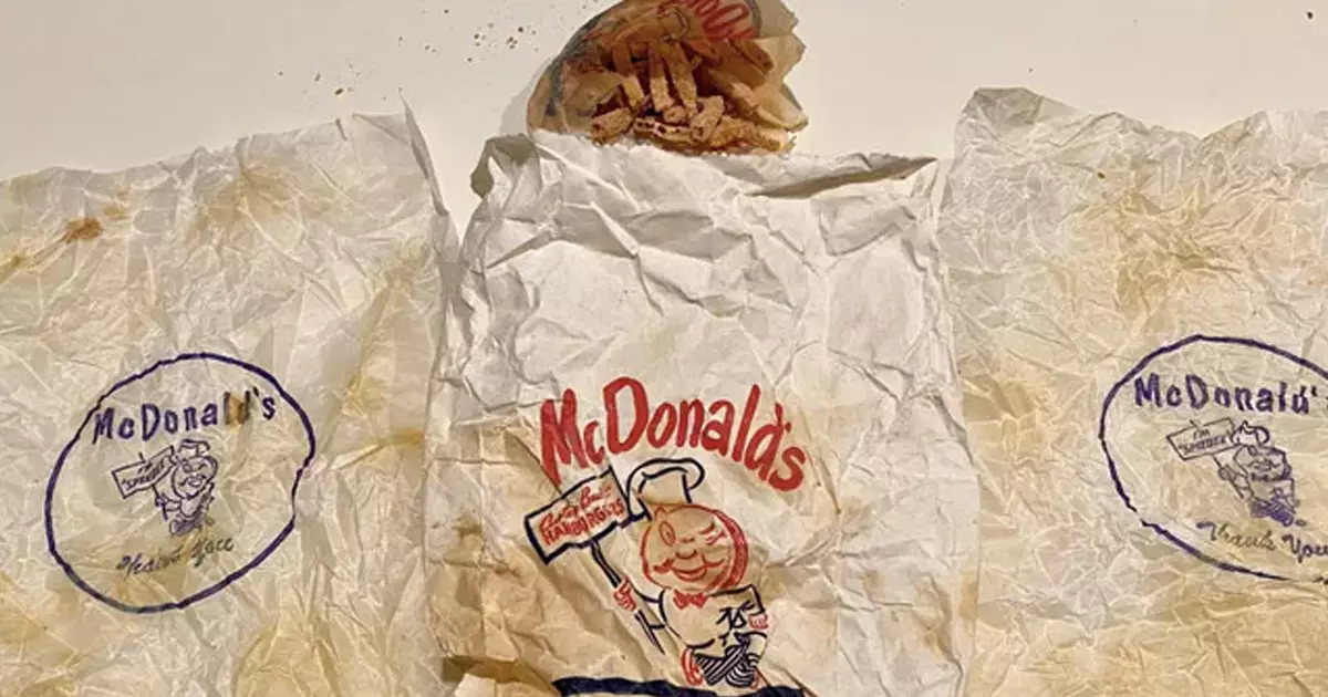 വീട്ടിലെ കുളിമുറി നവീകരണത്തിനിടെ 60 കൊല്ലം പഴക്കമുള്ള മക്ഡൊണാൾഡ് മീൽ ലഭിച്ചു. യു.എസ്സിലെ ഇല്ലിനോയിസിലാണ് ന്യൂയോർക്ക് പോസ്റ്റടക്കം റിപ്പോർട്ട് ചെയ്ത സംഭവം നടന്നത്. റോബെയന്നയാളുടെ വീട്ടിലെ കുളിമുറി നവീകരിക്കുന്നതിനിടെ പകുതി കഴിഞ്ഞ ഫ്രെഞ്ച് ഫ്രൈസിന്റെ പാക്കറ്റ് കണ്ടെടുക്കുകയായിരുന്നു. മക്ഡൊണാൾഡിന്റെ പഴയ കടലാസിൽ പൊതിഞ്ഞ നിലയിലായിരുന്നു ഭക്ഷണം ഉണ്ടായിരുന്നത്. 1955 മുതൽ 1961 വരെ മക്ഡൊണാൾഡ് ഉപയോഗിച്ച പാക്കേജിംഗായി ബിസിനസ് ഇൻസൈഡർ 2016ൽ പ്രസിദ്ധീകരിച്ച ലേഖനത്തിൽ ഈ കവർ ഉൾപ്പെടുത്തിയിരുന്നു.