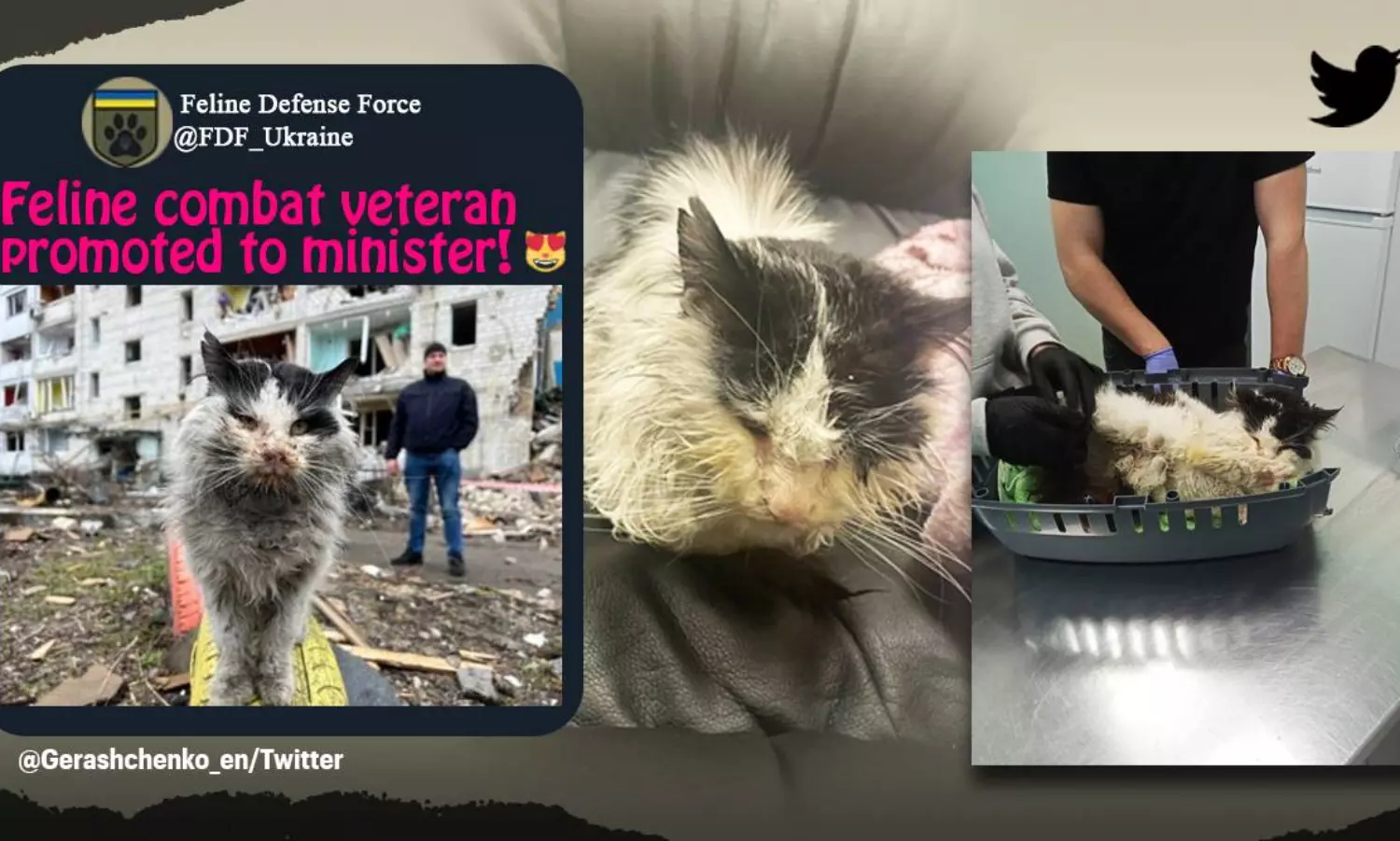 ''ബോറോദ്യങ്കയില്‍നിന്ന് അതിജീവിച്ച പൂച്ചയെ ഓര്‍ക്കുന്നുണ്ടോ? അവന്‍ ഇപ്പോള്‍ ആഭ്യന്തര കാര്യ മന്ത്രാലയത്തില്‍ താമസിക്കുന്നു, ഭക്ഷണം നല്‍കി, കുളിച്ചു, സ്‌നേഹിക്കുന്നു. എല്ലാ പ്രധാനപ്പെട്ട മീറ്റിഗുകളിലും അവന്‍ പങ്കെടുക്കും'' അദ്ദേഹം ട്വീറ്റ് ചെയ്തു. കടുത്ത മൃഗസ്നേഹിയായ ജെറാഷ്ചെങ്കോ, തകര്‍ന്ന കോണ്‍ക്രീറ്റ് കട്ടകള്‍ക്കിടയില്‍ നിന്നും രക്ഷിച്ചെടുത്ത പൂച്ചയുടെ ചിത്രങ്ങള്‍ പങ്കുവെച്ചിരുന്നു. യുക്രൈന്‍ സര്‍ക്കാരിന്‍റെ ദത്തെടുക്കലിനെ നെറ്റിസണ്‍സ് ആവേശത്തോടെയാണ് സ്വീകരിച്ചത്. ചിലര്‍ പൂച്ചയുടെ ഉടമകള്‍ക്ക് എന്തു സംഭവിച്ചിരിക്കാമെന്നും ആശങ്കപ്പെട്ടു.