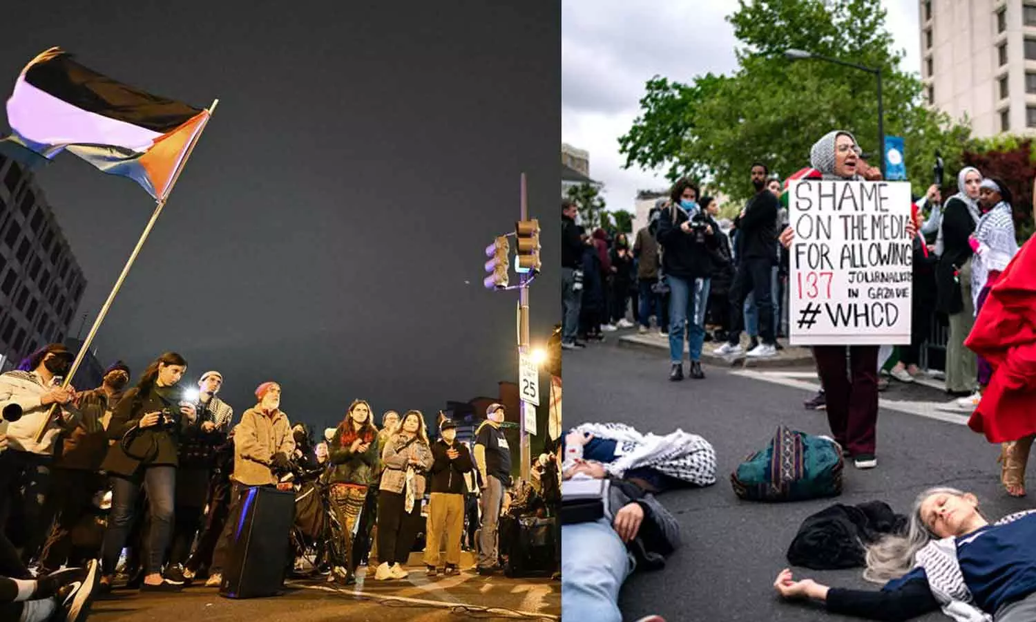 'നിങ്ങളെ ഓർത്ത് ലജ്ജിക്കുന്നു'; വൈറ്റ്ഹൗസ് ലേഖകരുടെ അത്താഴ വിരുന്നിനിടെയും പ്രതിഷേധം, ഫലസ്തീൻ പതാക ഉയർത്തി