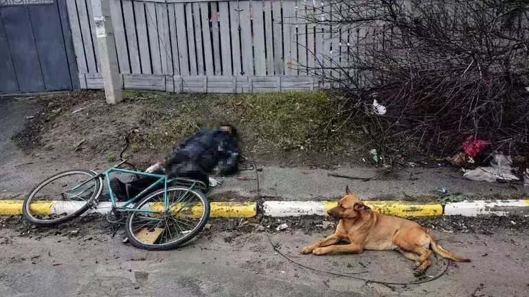 മരണത്തിലും വിട്ടുപിരിയാതെ; ഉടമയുടെ മൃതദേഹത്തിന് കാവലിരുന്ന് വളര്ത്തുനായ, യുക്രൈനിലെ നൊമ്പരക്കാഴ്ച