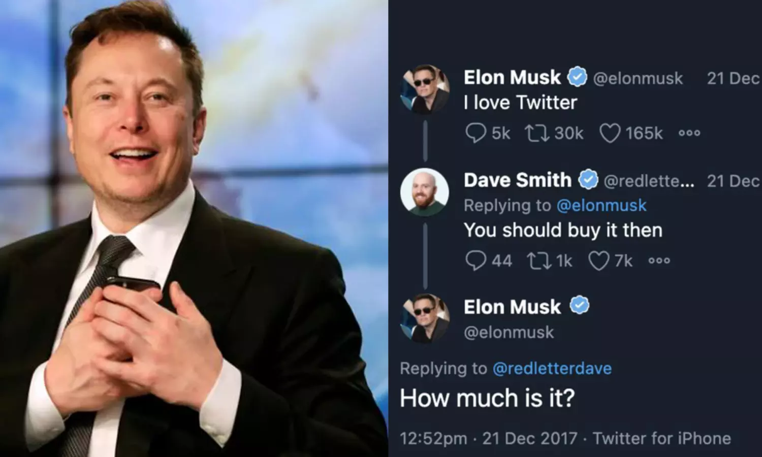 'ഐ ലവ് ട്വിറ്റർ' എന്ന് 2017 ഡിസംബർ 21 നാണ് ഇലോൺ മസ്ക് ട്വീറ്റ് ചെയ്തത്. 'അപ്പോൾ നിങ്ങളിത് വാങ്ങൂവെന്ന്' ഡേവ് സ്മിത്ത് മസ്കിന് മറുപടി നൽകി. അതിനോട് മസ്ക് തമാശയായി 'എത്രയാണിത്' എന്ന് ചോദിക്കുന്നുണ്ട്. ആ സംഭാഷണം അവിടെ അവസാനിച്ചിരുന്നു. എന്നാൽ അഞ്ചുവർഷത്തിനിപ്പുറം ഈ മാസം 16 ന് ഇലോൺ മസ്ക് ആ പഴയ ട്വീറ്റിന് കീഴിൽ തലകീഴായുള്ള സ്മൈലി ഇമോജി നൽകുകയും ചെയ്തു.