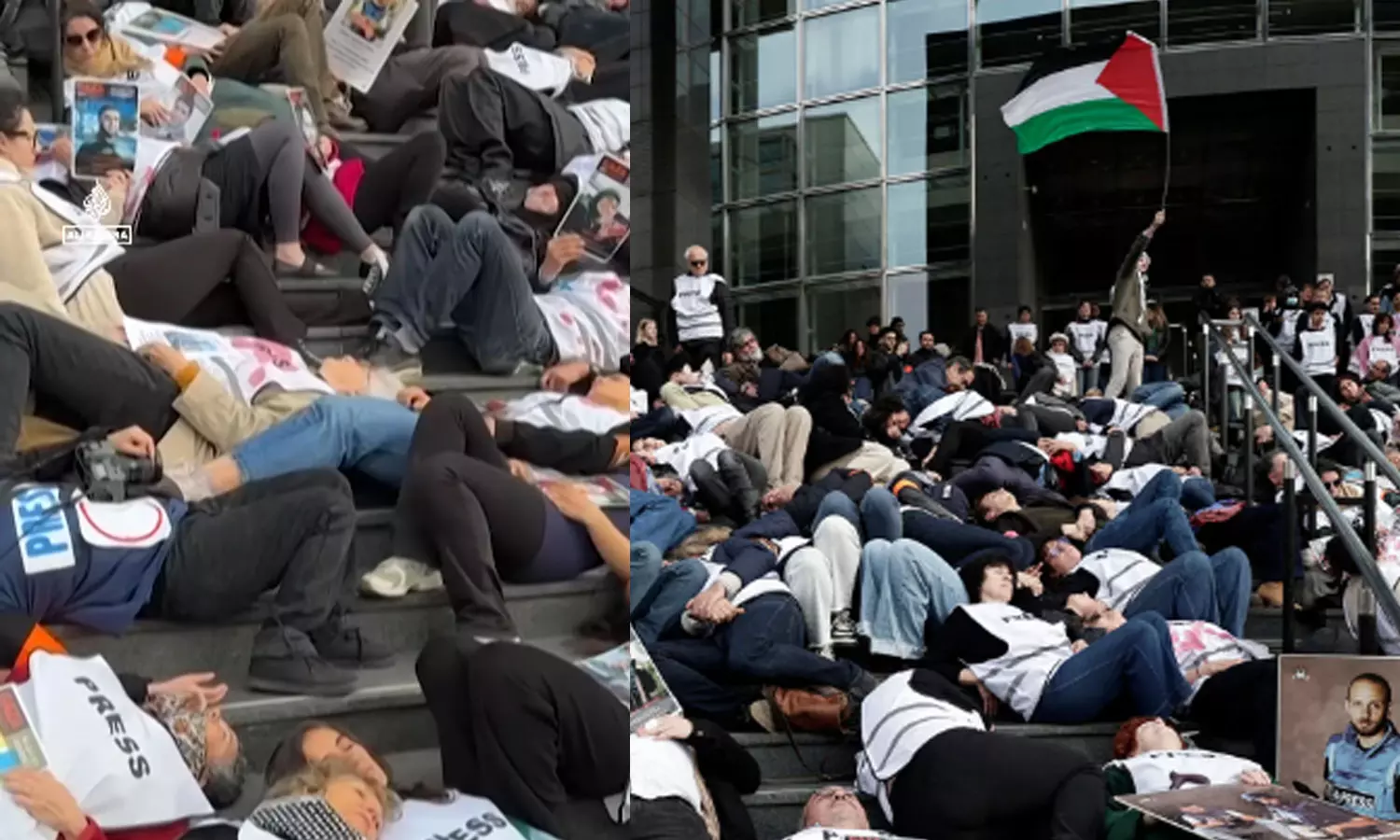 ഗസ്സയില് കൊല്ലപ്പെട്ട റിപ്പോർട്ടർമാരുടെ പേരുകൾ വായിച്ചപ്പോൾ ഫ്രഞ്ച് പത്രങ്ങളിലെ പ്രമുഖർ ഉൾപ്പെടെ 200ലധികം പത്രപ്രവർത്തകർ പാരീസിലെ ഒപ്പേര ബാസ്റ്റില്ലിന്റെ പടികളിൽ പ്രതീകാത്മകമായി മരിച്ച പോലെ കിടന്നു. ഗസ്സ റിപ്പോര്ട്ടര്മാരെ അനുസ്മരിപ്പിക്കും വിധമുള്ള ജാക്കറ്റുകളും മറ്റും ധരിച്ചായിരുന്നു മാധ്യമപ്രവര്ത്തകര് പരിപാടിക്കെത്തിയിരുന്നത്. കൊല്ലപ്പെട്ട മാധ്യമപ്രവര്ത്തകരുടെ ചിത്രങ്ങളും ഇടംപിടിച്ചു.