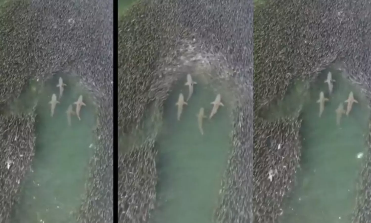 കടല്പ്പരവതാനി പോലെ മത്സ്യക്കൂട്ടം; കീറിമുറിച്ച് നീന്തുന്ന സ്രാവുകള്, രണ്ട് മില്യണലധികം കാഴ്ചക്കാരുമായി വീഡിയോ