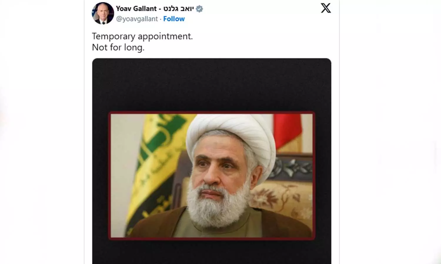 നയീം ഖാസിമിൻ്റെ ഫോട്ടോ പങ്കുവെച്ച് ഇസ്രായേൽ പ്രതിരോധമന്ത്രി യോവ് ഗാലന്റാണ് വധഭീഷണി മുഴക്കിയത്. 'താൽക്കാലിക നിയമനം മാത്രമാണിത്, അധികകാലം നിലനിൽക്കില്ല' എന്നാണ് ഫോട്ടോക്ക് ഗാലന്റ് അടിക്കുറിപ്പെഴുതിയിരിക്കുന്നത്.