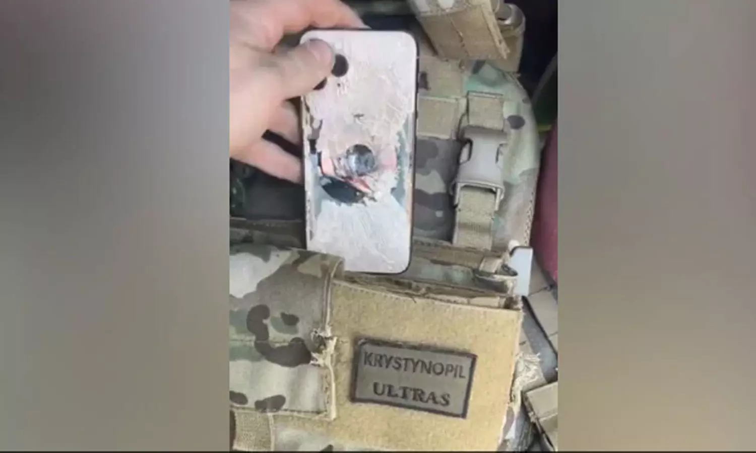 സൈനികൻ തന്റെ ബാഗിൽനിന്നും വെടിയുണ്ടയേറ്റ ഐഫോൺ പുറത്തെടുക്കുന്നതായി വീഡിയോയിൽ കാണാം
