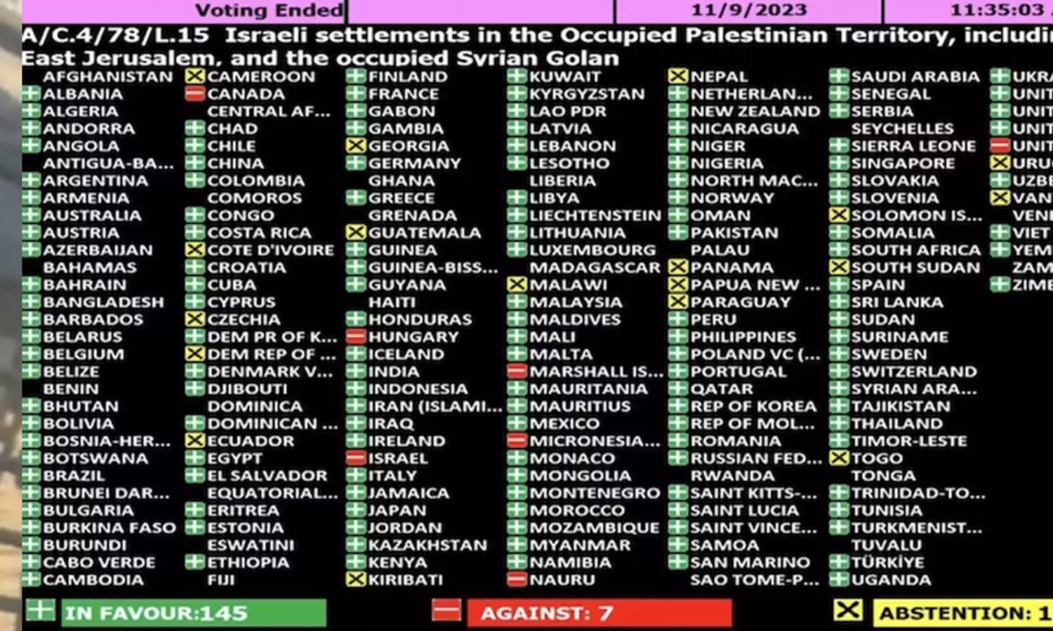 'കിഴക്കൻ ജറുസലേം ഉൾപ്പെടെ അധിനിവേശ ഫലസ്തീൻ പ്രദേശത്തും അധിനിവേശ സിറിയൻ ഗോലാനും ഉൾപ്പെടെയുള്ള ഇസ്രായേൽ സെറ്റിൽമെന്റുകൾ' എന്ന തലക്കെട്ടിലുള്ള യുഎൻ കരട് പ്രമേയം വൻ ഭൂരിപക്ഷത്തോടെയാണ് പാസാക്കിയത്. ഏഴ് രാജ്യങ്ങൾ പ്രമേയത്തെ എതിർത്തപ്പോൾ 18 രാജ്യങ്ങൾ വോട്ടെടുപ്പിൽ നിന്ന് വിട്ടുനിന്നു. യുഎസ്, കാനഡ, ഹംഗറി, ഇസ്രായേൽ, മാർഷൽ ദ്വീപുകൾ, ഫെഡറേറ്റഡ് സ്റ്റേറ്റ്സ് ഓഫ് മൈക്രോനേഷ്യ, നൗറു എന്നീ രാജ്യങ്ങളാണ് പ്രമേയത്തെ എതിർത്ത് വോട്ട് ചെയ്തത്.
