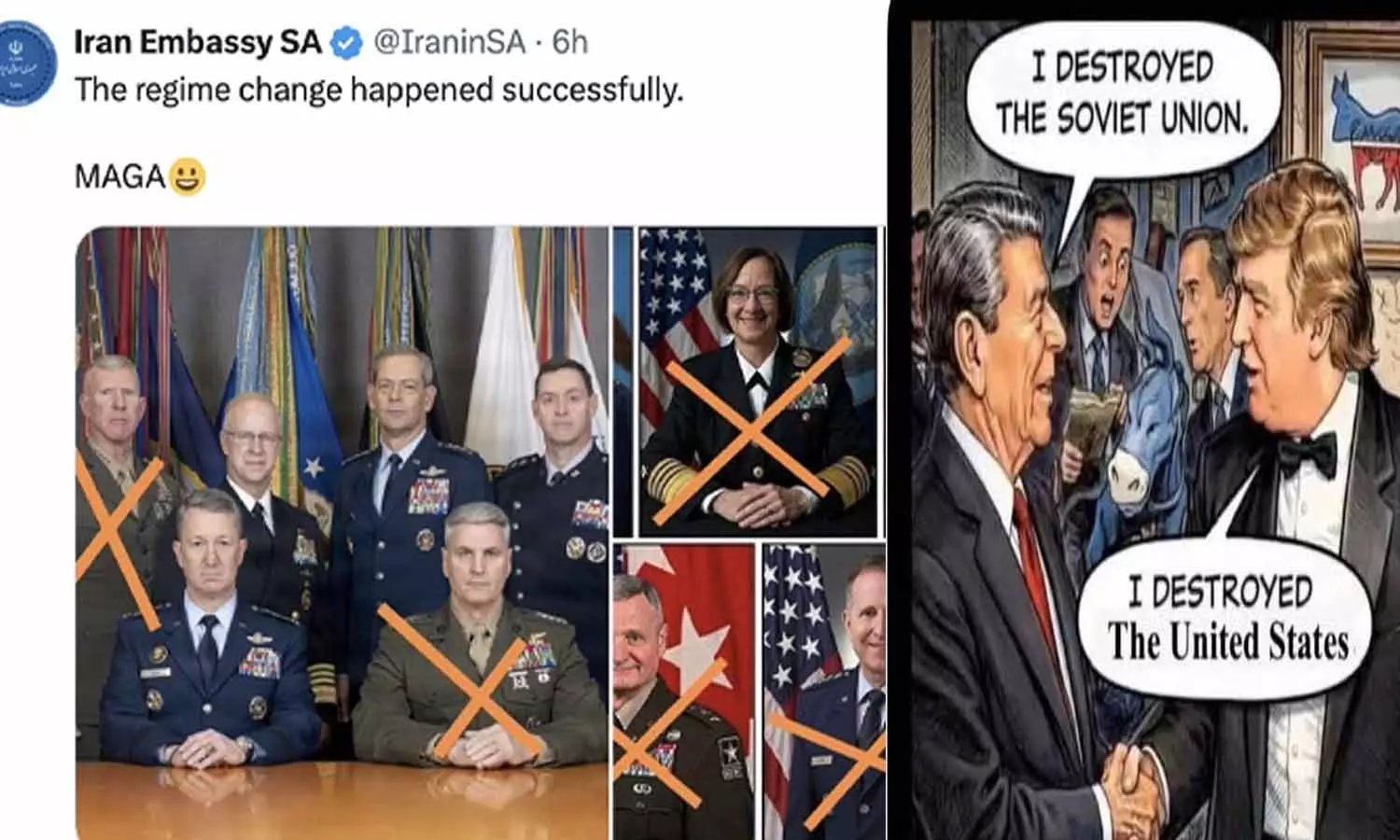 ഇറാന് എംബസി പോസ്റ്റ് ചെയ്ത മറ്റൊരു കാര്ട്ടൂണില് മുന് പ്രസിഡന്റ് റൊണാള്ഡ് റീഗനും ട്രംപും തമ്മിലുള്ള സംഭാഷണമാണ്. 'ഞാന് സോവിയറ്റ് യൂണിയനെ തകര്ത്തു' എന്ന് റീഗന് പറയുമ്പോള്, 'ഞാന് യുഎസിനെ തകര്ത്തു' എന്നാണ് ട്രംപ് മറുപടി പറയുന്നത്. 'ഓരോരുത്തര്ക്കും ഓരോ നേട്ടങ്ങളുണ്ട്' എന്നാണ് കാര്ട്ടൂണിന് അടിക്കുറിപ്പായി നല്കിയത്.