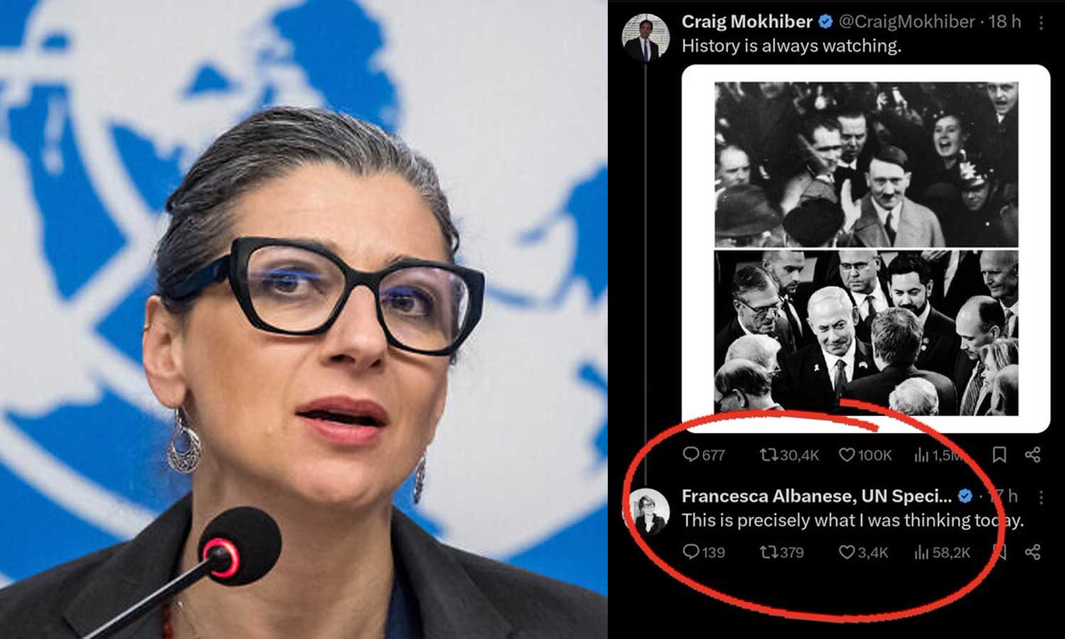 ജനീവ: ബെഞ്ചമിൻ നെതന്യാഹുവിനെ അഡോൾഫ് ഹിറ്റ്ലറുമായി താരതമ്യം ചെയ്യുന്ന പോസ്റ്റിനെ പിന്തുണച്ച യു.എൻ ഉദ്യോഗസ്ഥയ്ക്ക് നേരെ ഇസ്രായേൽ വിമർശനം. യു.എൻ മനുഷ്യാവകാശ പ്രവര്ത്തകയും ഉദ്യോഗസ്ഥയുമായ ഫ്രാൻസെസ്ക അൽബനീസിന് നേരെയാണ് 'ജൂത വിരുദ്ധ' എന്ന വിമർശനവുമായി ഇസ്രായേൽ രംഗത്ത് വന്നത്. ഫലസ്തീൻ മേഖലകളിലെ യു.എൻ യോഗ വിവരങ്ങൾ റിപ്പോർട്ട് ചെയ്യുന്ന ഉദ്യോഗസ്ഥയാണ് അൽബനീസ്.