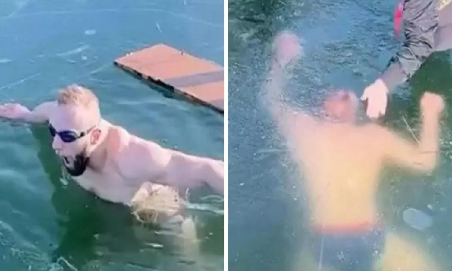 അല്പം വൈകിയിരുന്നേല് ഐസായേനേ; തണുത്തുറഞ്ഞ തടാകത്തില് നീന്തി യുവാവ്