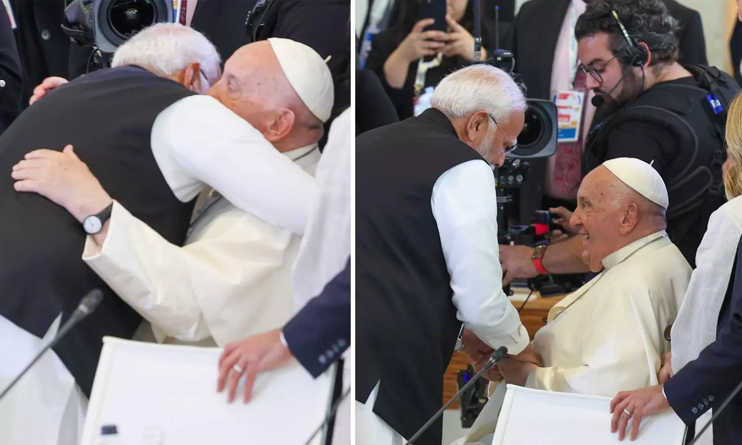 ഇറ്റാലിയൻ പ്രധാനമന്ത്രി ജോർജിയ മെലോണിക്കൊപ്പം വീൽചെയറിലാണ് 87കാരനായ ഫ്രാൻസിസ് മാർപാപ്പ ഉച്ചക്കോടിക്കെത്തിയത്. ഫ്രഞ്ച് പ്രസിഡന്റ് ഇമ്മാനുവൽ മാക്രോൺ, യൂറോപ്യൻ പാർലമെന്റ് മേധാവി ഉർസുല വോൺ ദേർ ലിയൻ എന്നിവരും മാർപാപ്പയുടെ ആശീർവാദം ഏറ്റുവാങ്ങനെത്തി. ഇറ്റാലിയൻ പ്രധാനമന്ത്രിയുടെ ക്ഷണിതാവായാണ് പോപ്പ് ഉച്ചകോടിക്കെത്തിയത്. ആദ്യമായിട്ടാണ് പോപ്പ് ജി7 നേതാക്കളെ അഭിസംബോധന ചെയ്യുന്നത്.