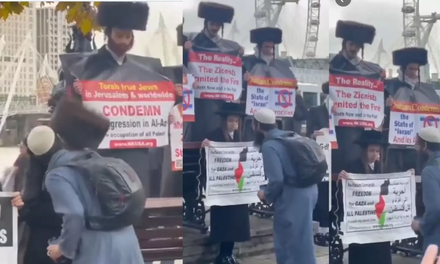 ഫലസ്തീനെ പിന്തുണച്ചതിന് ഓർത്തഡോക്സ് ജൂതരെ ചുംബിച്ച് മുസ്ലിം യുവാവ്. സയണിസത്തിനും സയണിസ്റ്റ് രാഷ്ട്രമായ ഇസ്രായേലിന്റെ ക്രൂരതയ്ക്കുമെതിരെ പ്രതിഷേധിച്ച ജൂതരെ യുവാവ് ചുംബിക്കുന്ന വീഡിയോ എക്സിൽ (ട്വിറ്ററിൽ) നിരവധി പേരാണ് പങ്കുവെച്ചത്. ഇസ്രായേൽ - ഫലസ്തീൻ യുദ്ധ വിവരങ്ങൾ കൈമാറുന്ന ജാക്സൻ ഹിൻങ്ക്ലെ, സെൻസേർഡ് മെൻ തുടങ്ങിയവരൊക്കെ ഈ വീഡിയോ പോസ്റ്റ് ചെയ്തിട്ടുണ്ട്. സയണിസത്തിനും ഇസ്രായേൽ ക്രൂരതയ്ക്കുമെതിരെയുള്ള പോസ്റ്ററുകൾ പിടിച്ചു നിൽക്കുന്ന ജൂത മത വിശ്വാസികളെ ഓരോരുത്തരെയായി ചുംബിക്കുന്ന മുസ്ലിം യുവാവാണ് വീഡിയോയിലുള്ളത്. ഈ വീഡിയോ ഒരു യൂറോപ്യൻ രാജ്യത്ത് നിന്നുള്ളതാണെന്നാണ് സ്പ്രിൻറർ എന്ന ട്വിറ്റർ ഹാൻഡിൽ പറയുന്നത്.