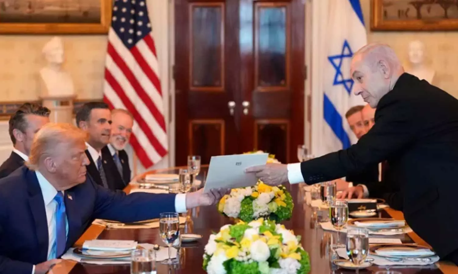 'ട്രംപ് ഓരോ രാജ്യത്തും ഓരോ പ്രദേശത്തുമായി സമാധാനം കെട്ടിപ്പടുക്കുകയാണ്.ഗസ്സയിലെ ഇസ്രായേലും ഹമാസും തമ്മിലുള്ള യുദ്ധം ഉൾപ്പെടെ ലോകമെമ്പാടുമുള്ള സംഘർഷങ്ങൾ അവസാനിപ്പിക്കാനുള്ള അദ്ദേഹത്തിന്റെ ശ്രമങ്ങൾക്ക് അർഹമായ ഒന്നാണിത്, മിസ്റ്റർ പ്രസിഡന്റ്, ഞാൻ നോബൽ സമ്മാന കമ്മിറ്റിക്ക് അയച്ച കത്ത് നിങ്ങൾക്ക് മുന്നിൽ കാണിക്കാന് ആഗ്രഹിക്കുന്നു. നിങ്ങള് അതിന് അര്ഹനാണ്'..നെതന്യാഹു പറഞ്ഞു. ഇസ്രായേലികൾക്ക് മാത്രമല്ല,ജൂതജനതക്കും ലോകത്തെ എല്ലാ ജനങ്ങൾക്കം വേണ്ടി താങ്കളുടെ പ്രവർത്തനത്തെ അഭിനന്ദിക്കുന്നുവെന്നും നെതന്യാഹു കൂട്ടിച്ചേര്ത്തു.
