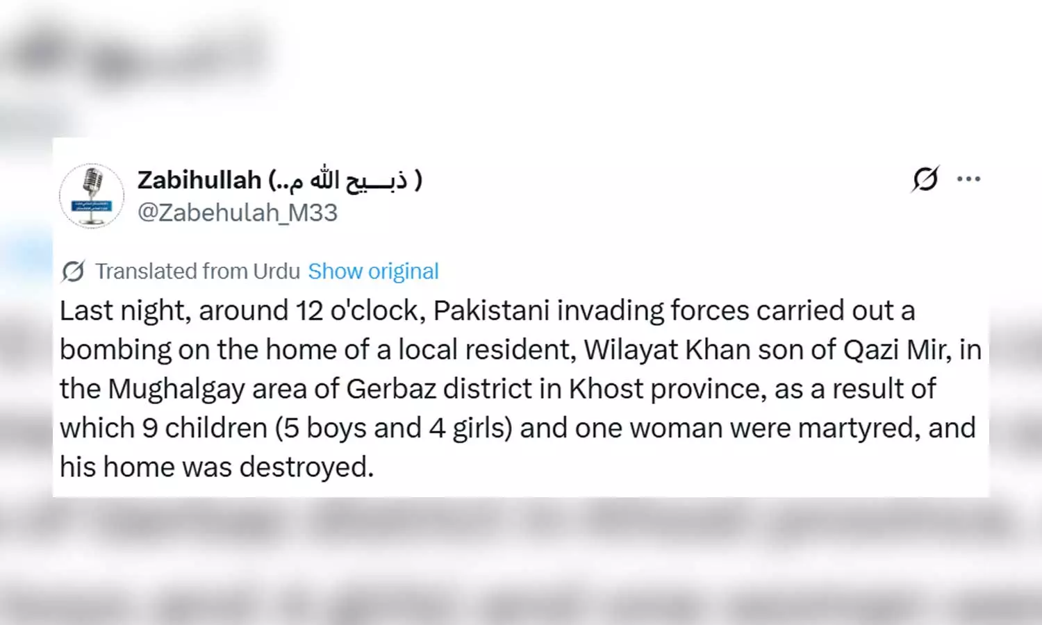 ഖോസ്റ്റ് പ്രവിശ്യയിലെ ഗുർബുസ് ജില്ലയിൽ രാത്രി ആക്രമണം നടന്നതായി താലിബാൻ ഭരണകൂട വക്താവ് സാബിഹുള്ള മുജാഹിദ് പറഞ്ഞു.
