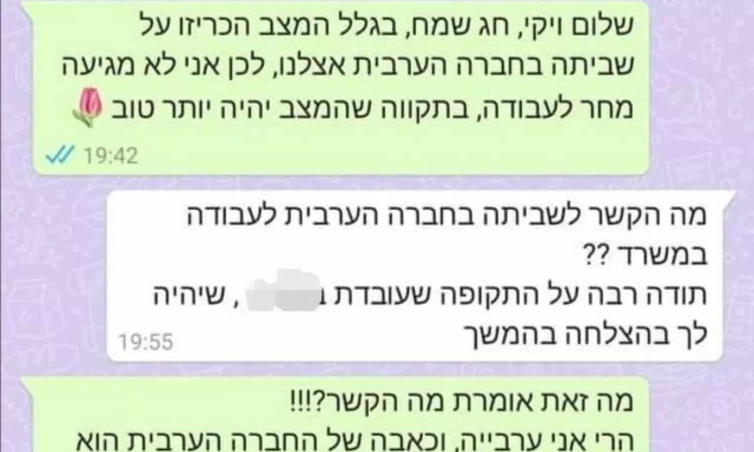 ഹീബ്രൂ ഭാഷയിലുള്ള വാട്സ് ആപ്പ് സന്ദേശങ്ങള് പുറത്തുവിട്ടുകൊണ്ട് മിഡില് ഈസ്റ്റ് ഐ ആണ് ഇക്കാര്യം റിപ്പോര്ട്ടു ചെയ്തിരിക്കുന്നത്. പൊതുപണിമുടക്ക് കാരണം ചൊവ്വാഴ്ച ജോലിക്ക് ഹാജരാകാനാകില്ലെന്ന് തൊഴിലുടമകളെ അറിയിക്കാനായി അയച്ച വാട്സ്ആപ്പ് സന്ദേശത്തിന് മറുപടിയായാണ് ഉടനെ തന്നെ അവരെ പുറത്താക്കിയെന്നുള്ള സന്ദേശം അയച്ചിരിക്കുന്നത്.