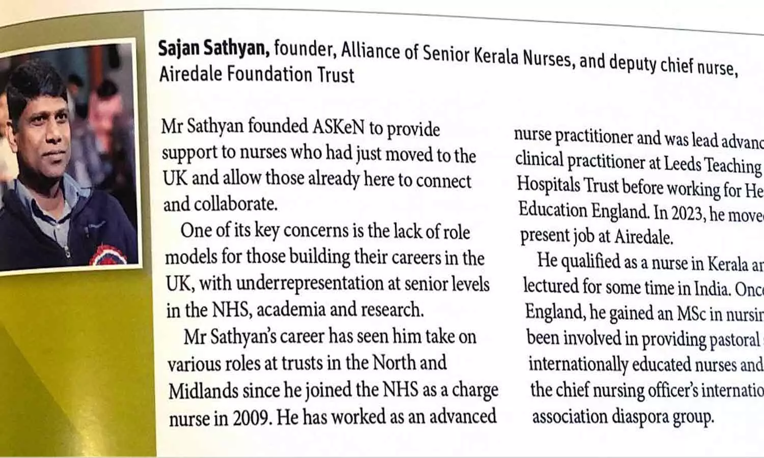 അലയൻസ് ഓഫ് സീനിയർ കേരള നഴ്സസിന്റെ സ്ഥാപകൻ സാജൻ സത്യനാണ് പട്ടികയിൽ ഇടം പിടിച്ചത്