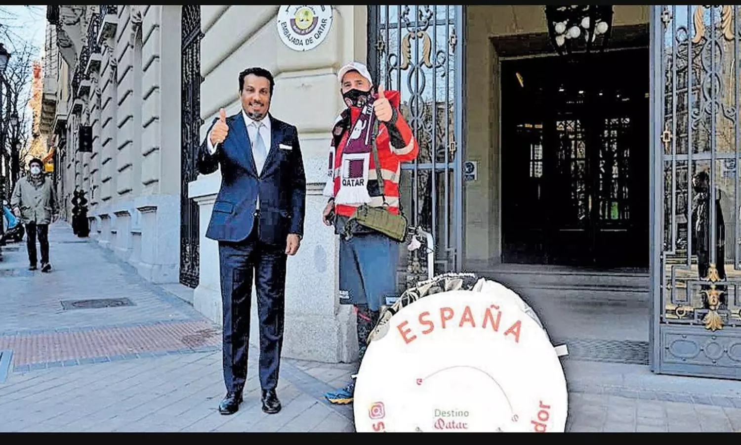 El Embajador de Qatar, Abdalla Al-Hamar ha recibido hoy a Santiago Sánchez para desearle suerte en su largo camino andando desde Madrid hasta Qatar pic.twitter.com/4WF6hWZqkQ