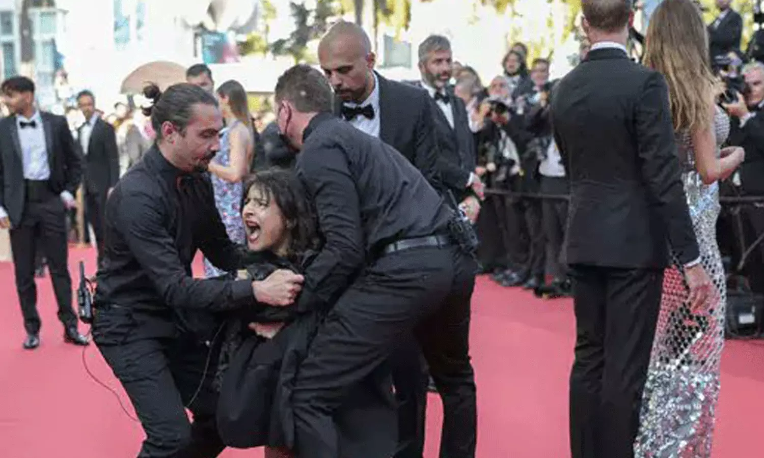 ചുവന്ന നിറമുള്ള അടിവസ്ത്രം ധരിച്ചെത്തിയ യുവതി റെഡ് കാർപ്പറ്റിലെത്തി ഫോട്ടോഗ്രാഫർമാർക്ക് പോസ് ചെയ്യുകയായിരുന്നു. ഇതോടെ ഗാർഡുകളെത്തി ഇവരെ കറുത്ത കോട്ട് ധരിപ്പിക്കുകയും വേദിയിൽ നിന്ന് പുറത്തെത്തിക്കുകയും ചെയ്തു.