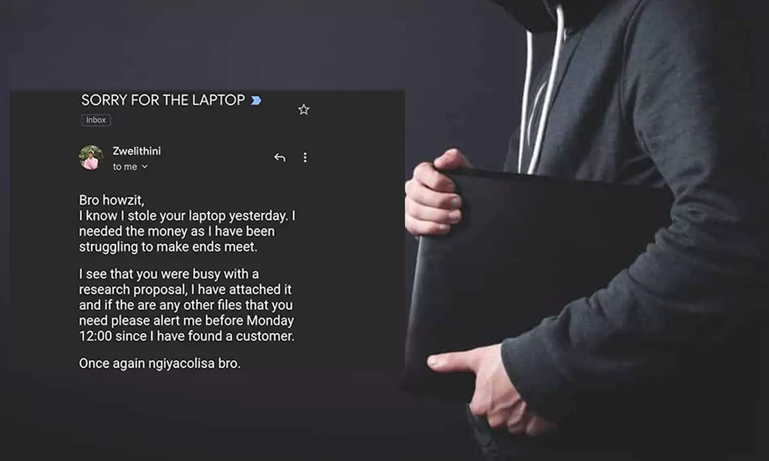 ലാപ്ടോപ് മോഷ്ടിച്ചതിനു പിന്നാലെ ഉടമയ്ക്ക് മെയിൽ അയച്ച് മോഷ്ടാവ്. സെവലി തിക്സോ എന്നയാളാണ് തനിക്കുണ്ടായ അനുഭവം ട്വിറ്ററിലൂടെ പങ്കുവെച്ചത്. മെയില് വായിച്ച് എന്ത് ചെയ്യണമെന്നറിയാത്ത അവസ്ഥയിലാണ് താനെന്നുെം അദ്ദേഹം പറയുന്നു.