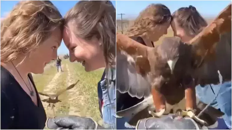 ശിരസ് ചേർത്തുനിൽക്കുന്ന യുവതികൾക്കിടയിലൂടെ പറന്ന് കയ്യിലിരുന്ന് പരുന്ത്; 7 മില്യണലധികം പേര്‍ കണ്ട അമ്പരിപ്പിക്കുന്ന കാഴ്ച