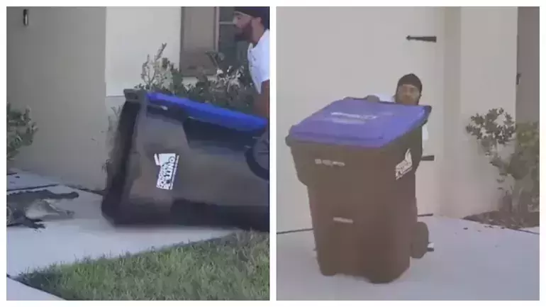 വീടിന് മുന്നില് അപകടകാരിയായ മുതല, ചവുറ്റുകൊട്ടയിലാക്കി യുവാവ്; വീഡിയോ